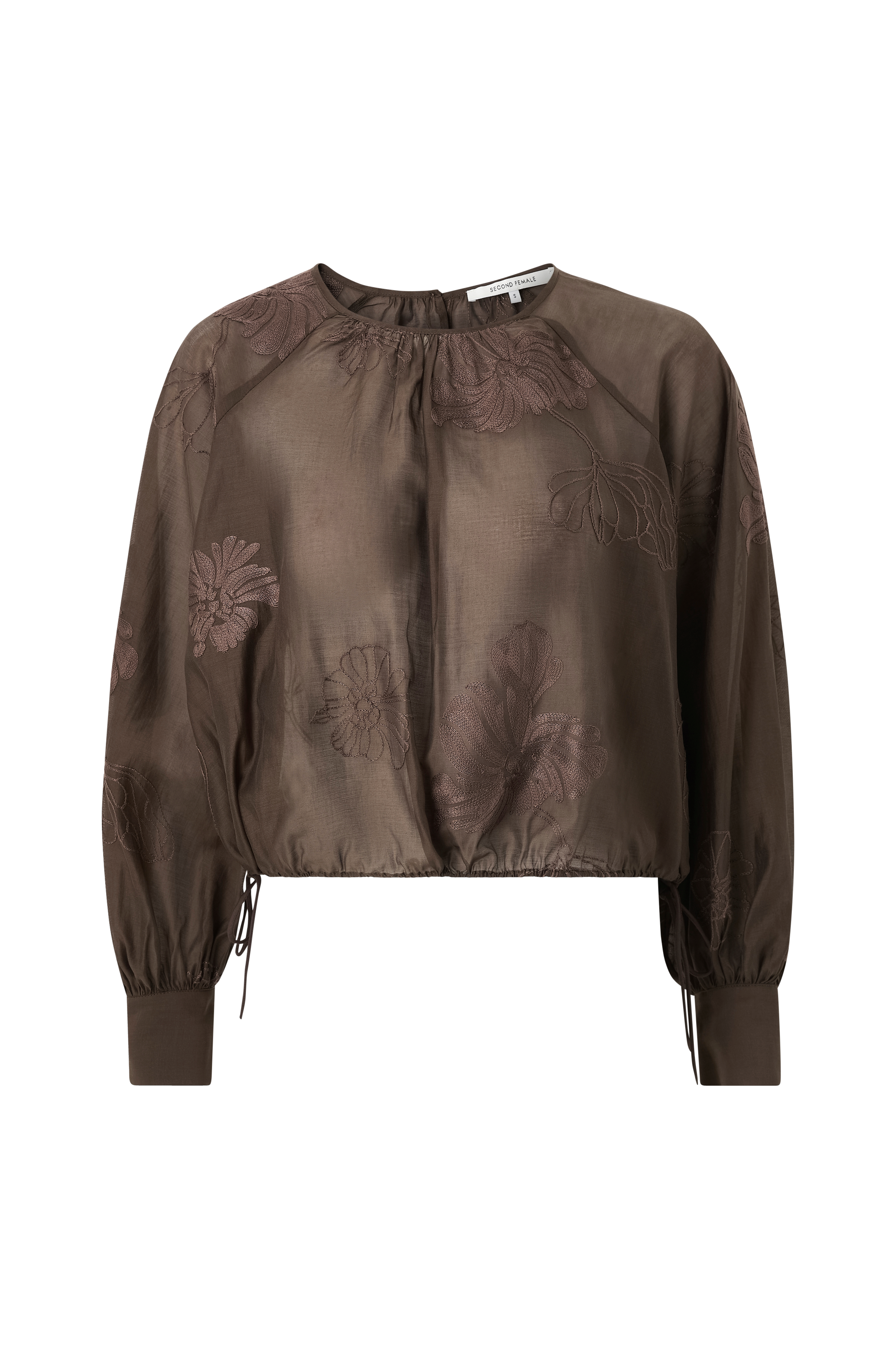 • Semitransparent bluse• Rund halsudskæring• Nøglehulsåbning bagpå• Lange raglanærmer• Manchetter• Træksnørre ved nederste kant• Normal pasform