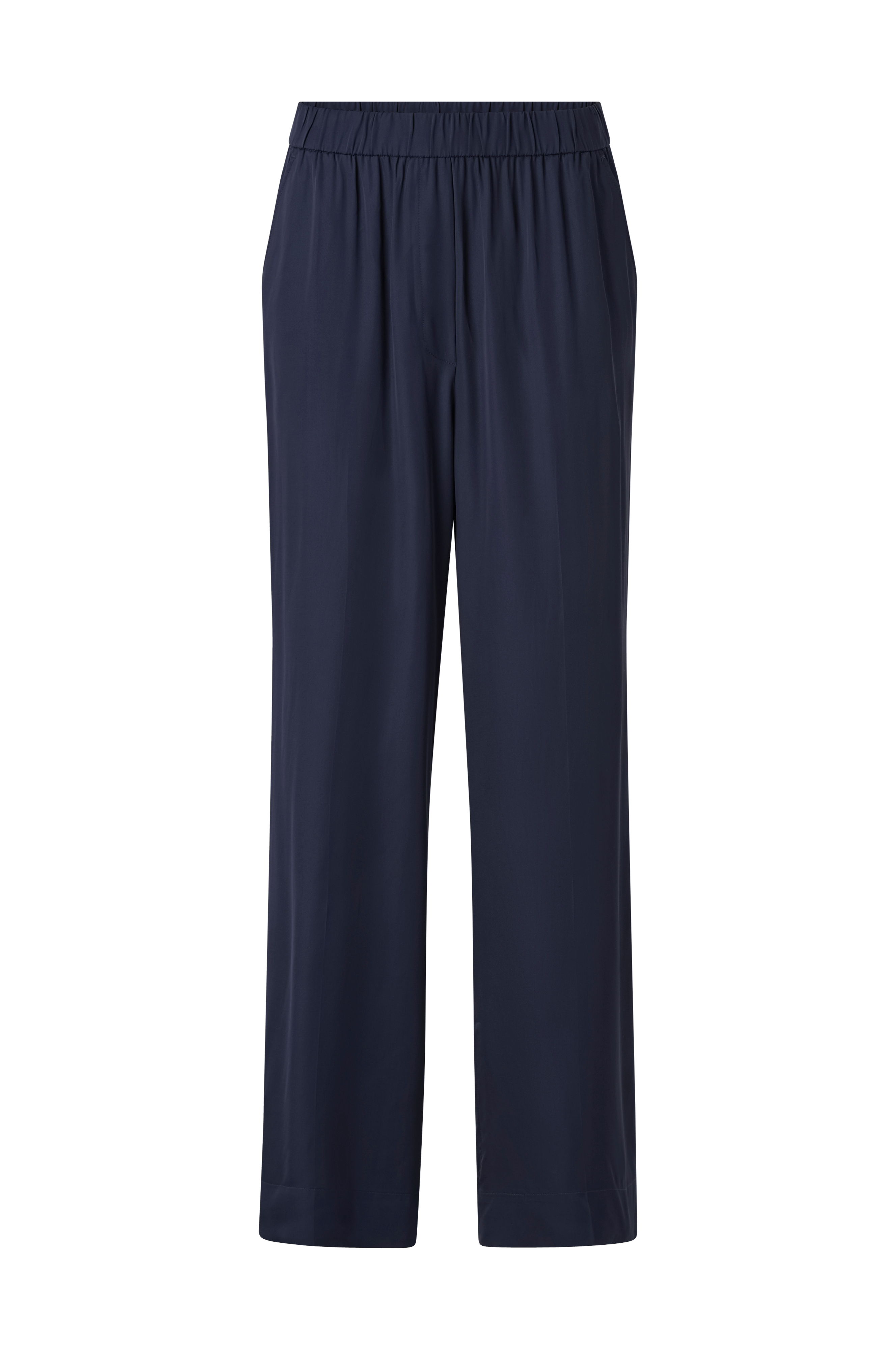 • Bukser i silke-look• Blød, skinnende viskose med draperet effekt• Elastisk talje• Lige, brede ben• Sidelommer• Snydelommer bagpå• Indre benlængde: 77 cm i størrelse S