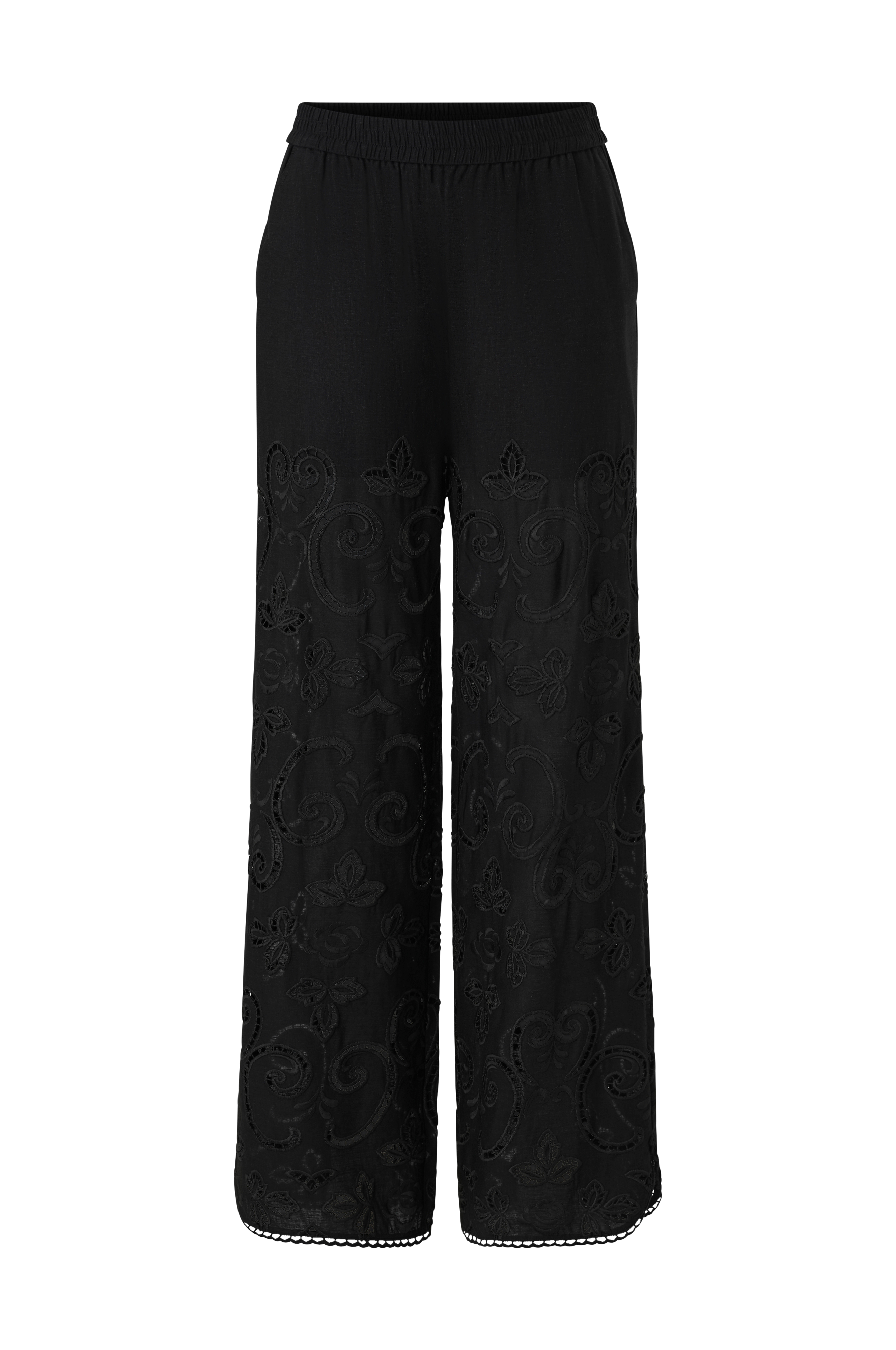 • Bukser i hørblanding med løs pasform og hulbroderet mønster• Elastisk talje• Sidelommer• Kort inderfor på toppen• Slids nederst• Blondekant ved enden af benene• Indre benlængde: 79 cm i størrelse S