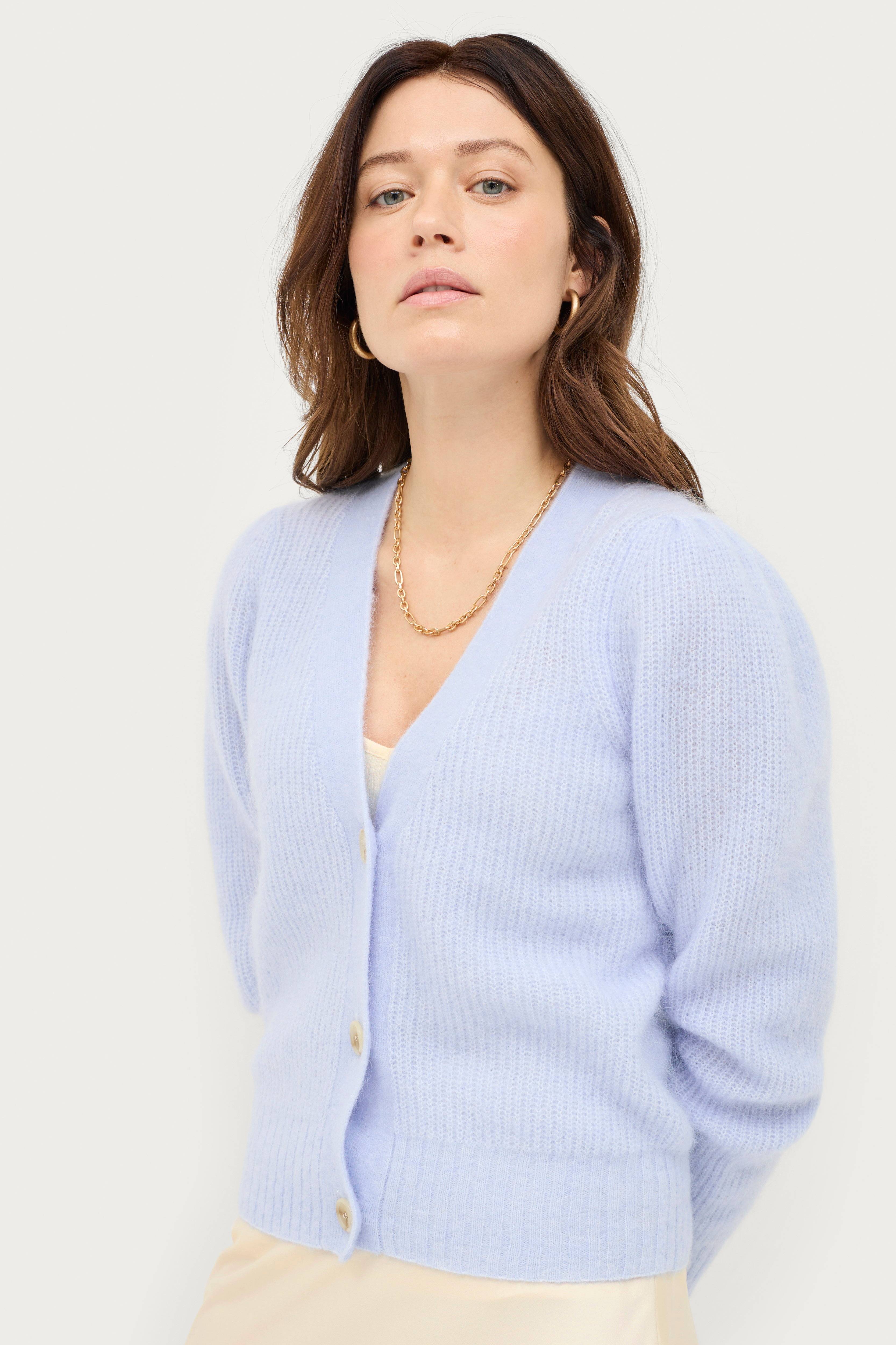 • Cardigan i mohairblanding• V-udskæring• Knapper foran• Lange ballonærmer