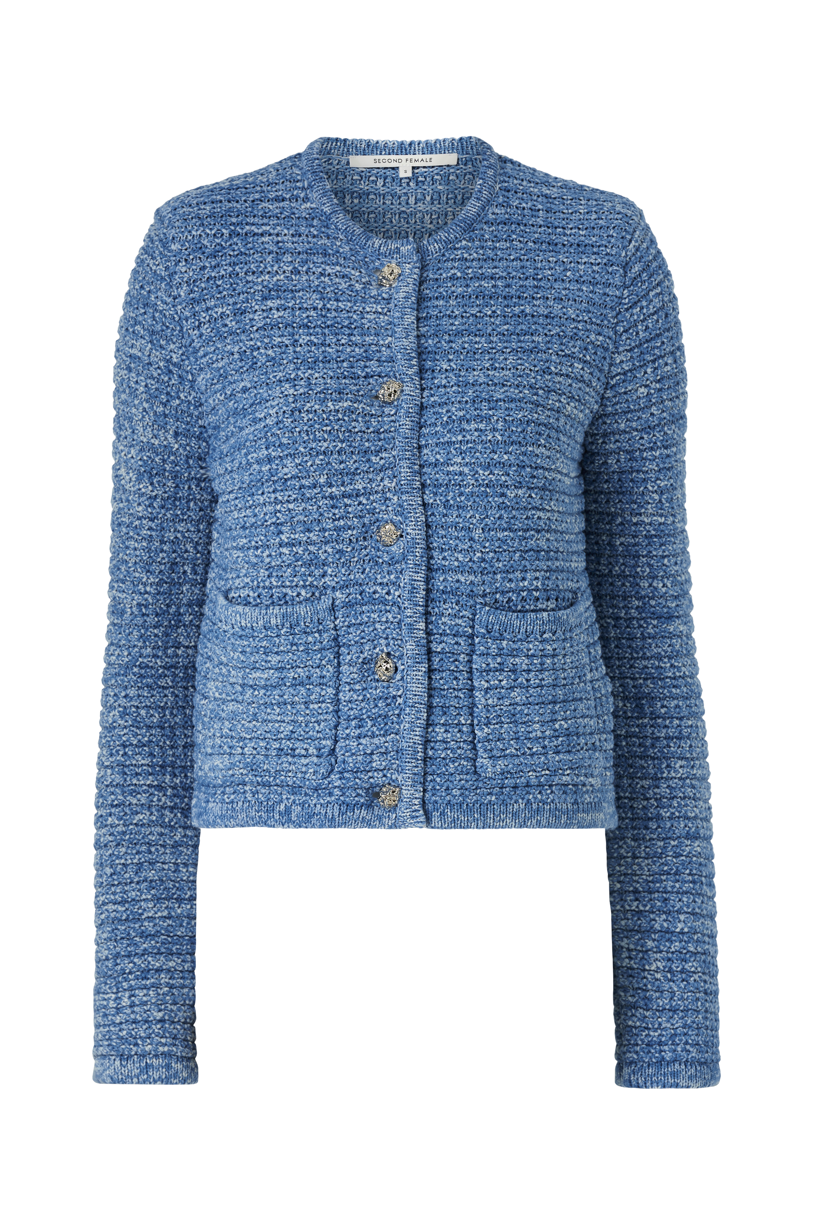 • Lige, mønstervævet model• Rund hals• Dekorative, sølvfarvede knapper• Lommer• Ekstra langt ærme