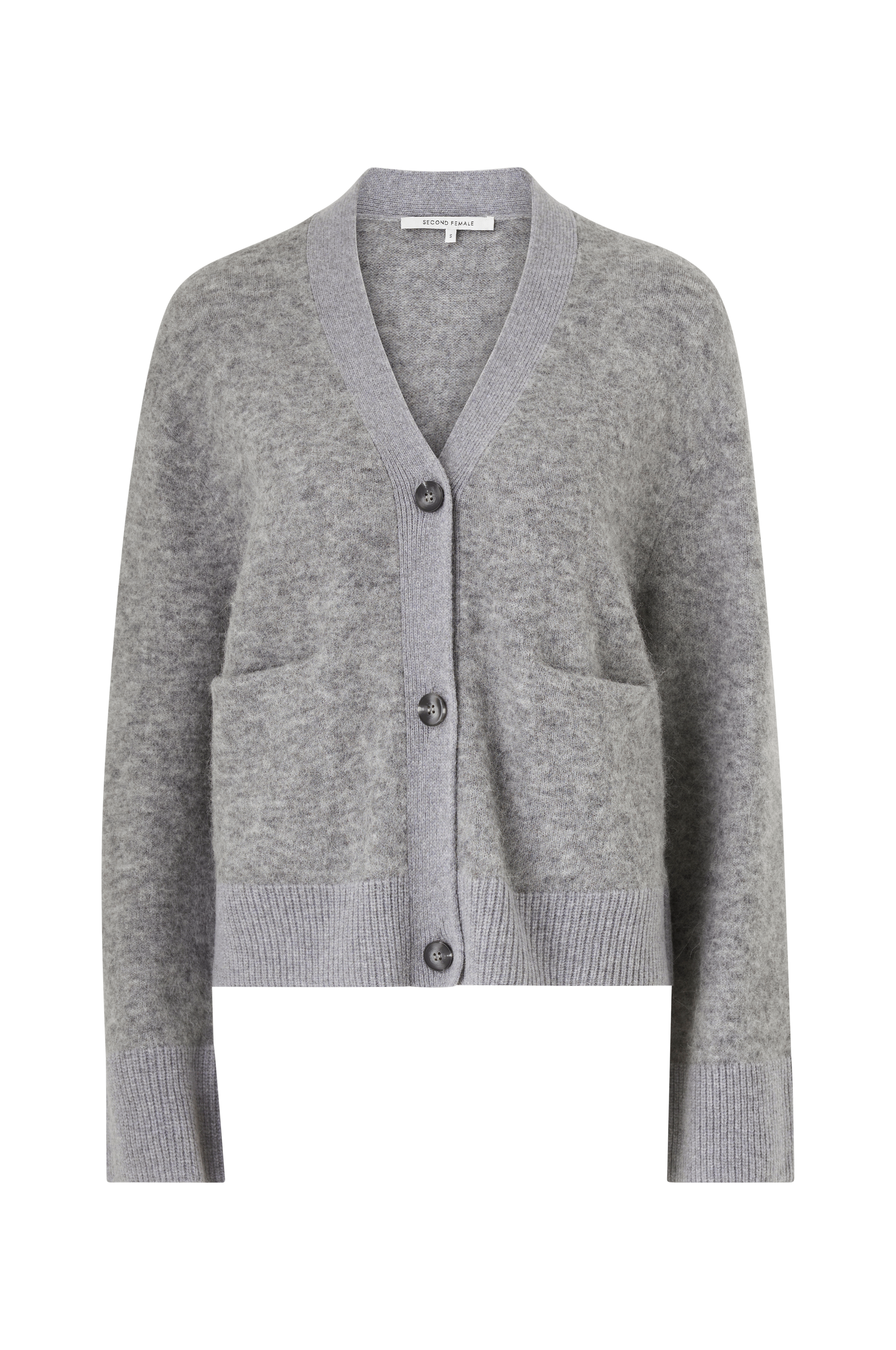 • Fintstrikket cardigan i blødt, luftigt materiale• Lange arme med nedsænkede skuldre• V-formet halsudskæring• Knapstolpe foran med dekorative knapper• Skjulte lommer foran• Ribstrik ved manchetterne, nederst og ved åbningen
