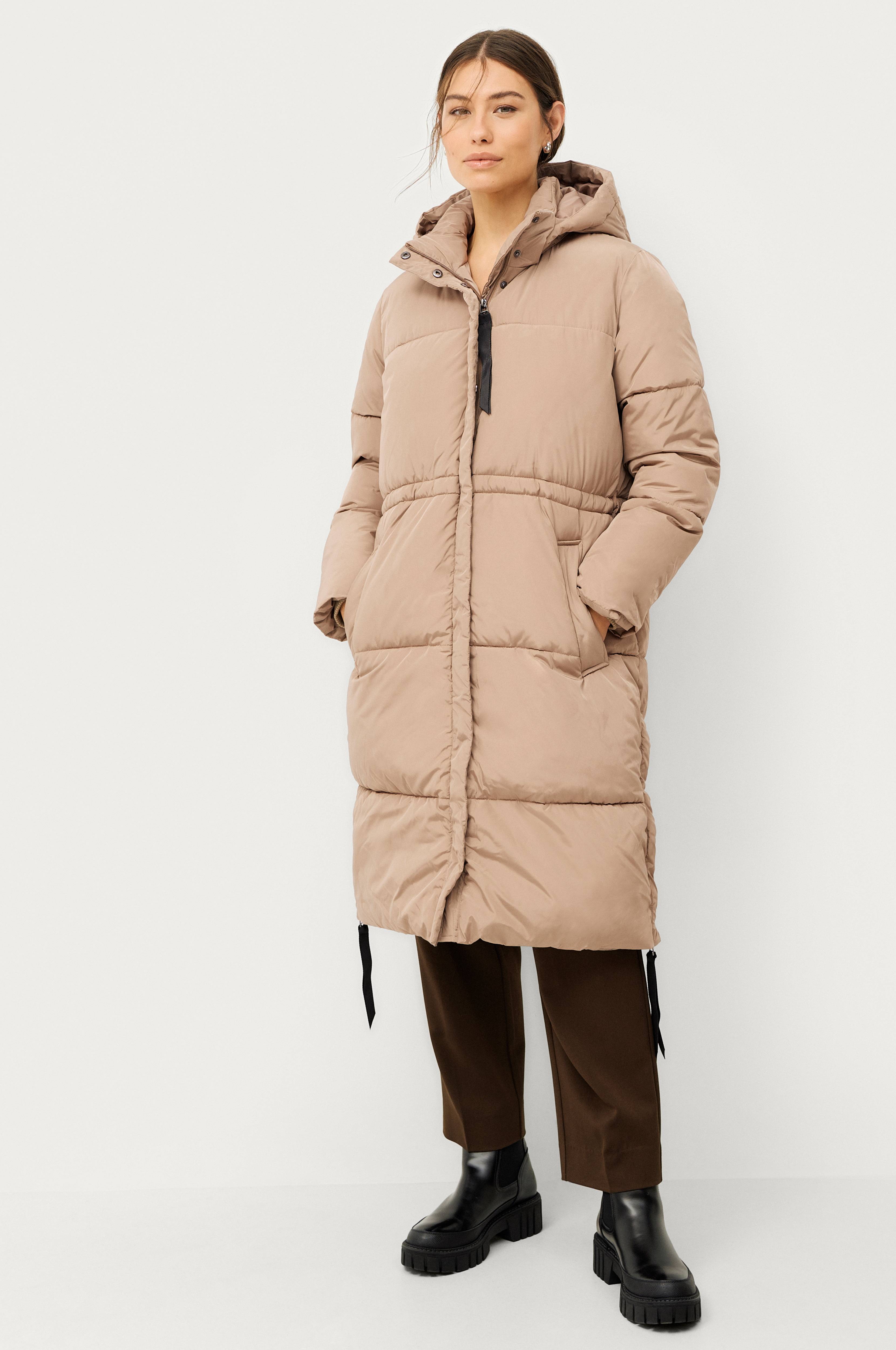 • Quiltet, foret frakke • Aftagelig hætte • To-vejs lynlås • Vindflap over lynlåsen med trykknapper • To lommer med blødt fleece for • Indvendig træksnørre ved taljen • Lynlåse nede i siderne • Ribmanchetter ved ærmeafslutningerne • Længde: 105 cm i størrelse S