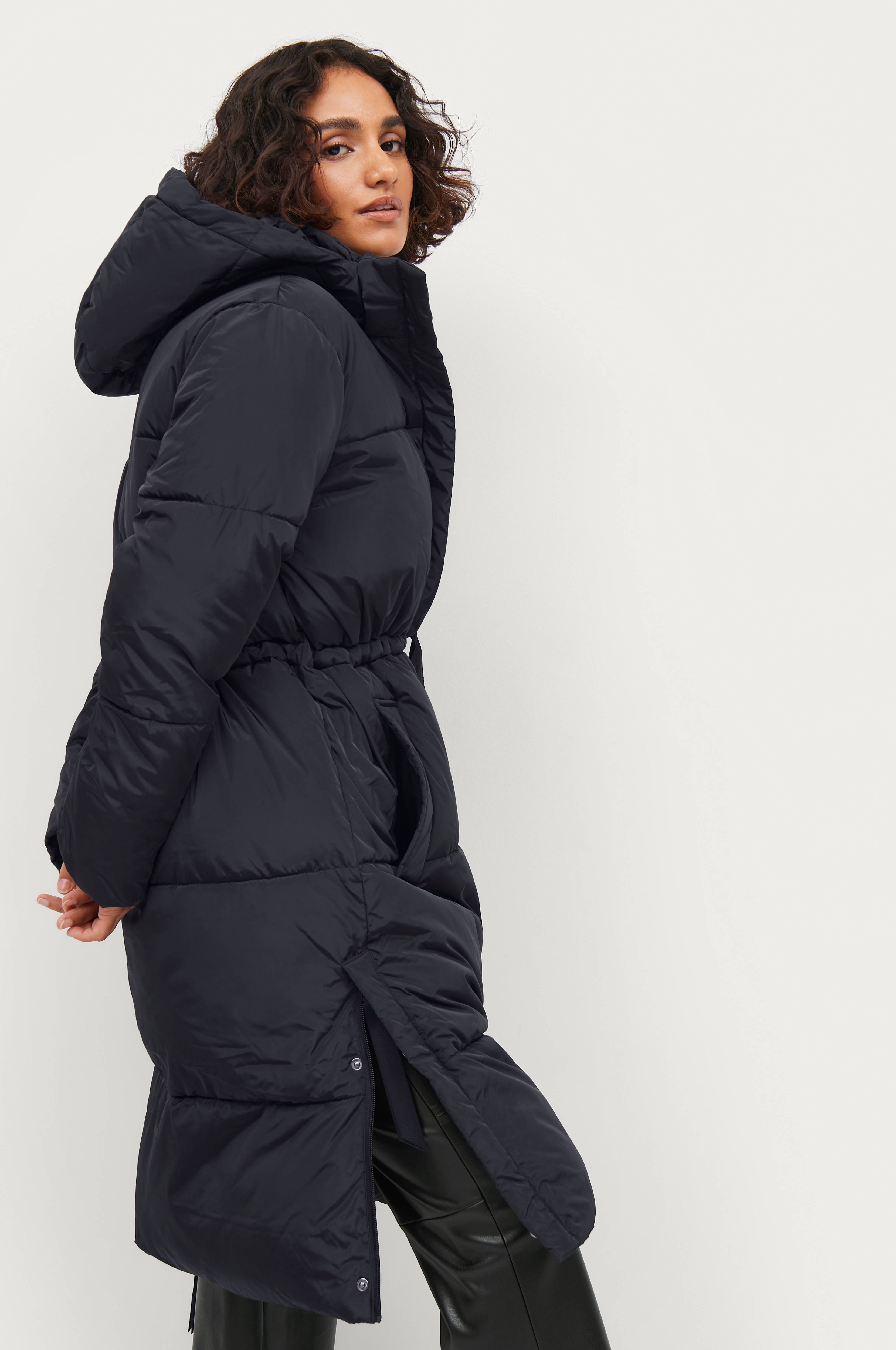 • Quiltet, foret frakke • Aftagelig hætte • To-vejs lynlås • Vindflap over lynlåsen med trykknapper • To lommer med blødt fleece for • Indvendig træksnørre ved taljen • Lynlåse nede i siderne • Ribmanchetter ved ærmeafslutningerne • Længde: 105 cm i størrelse S