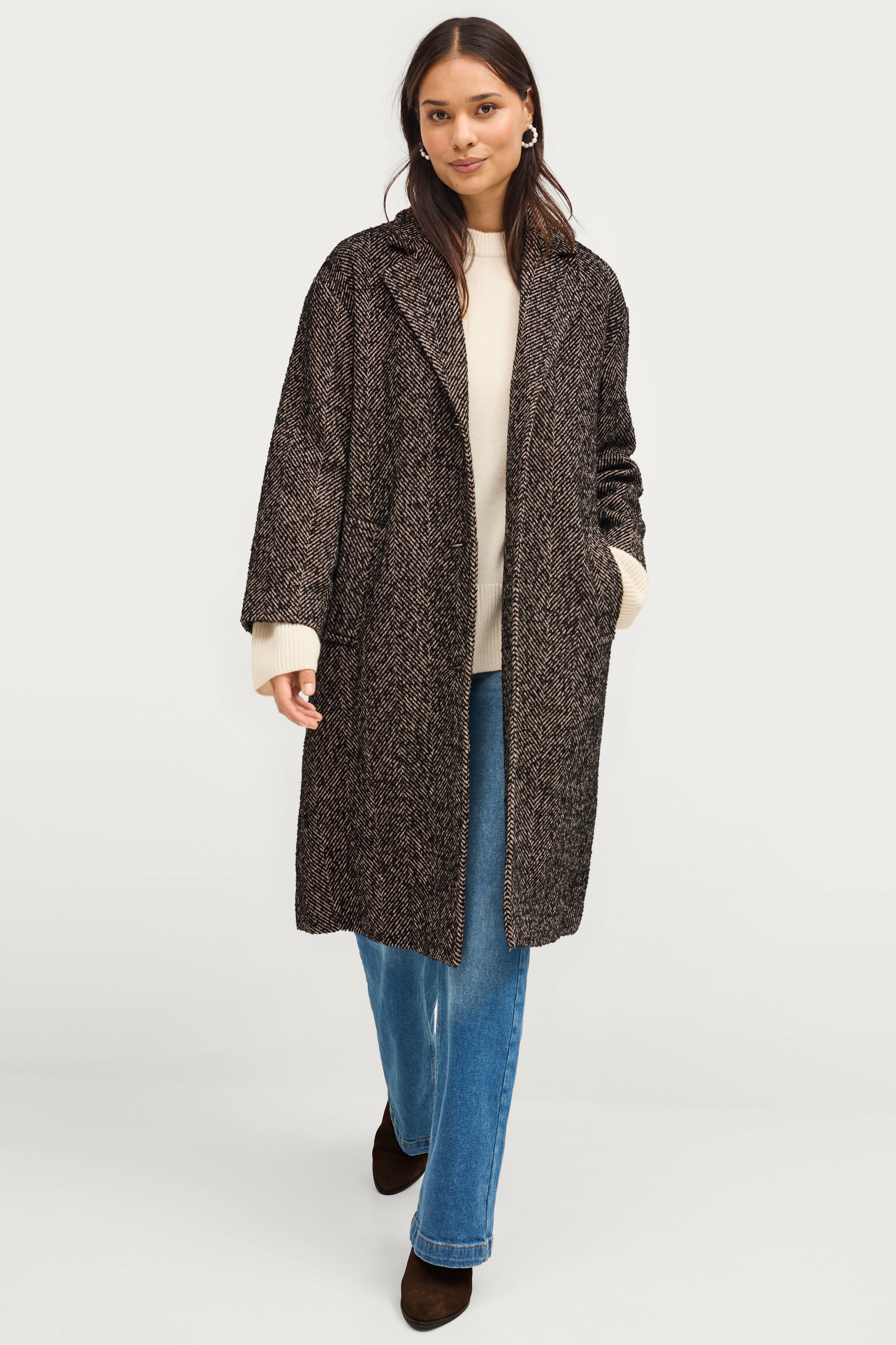 • Frakke i uldblanding med sildebensmønster• Afslappet pasform• Tre knapper• To lommer• Vævet, glat for• Slids nede bagved• Længde: 110 cm i størrelse S