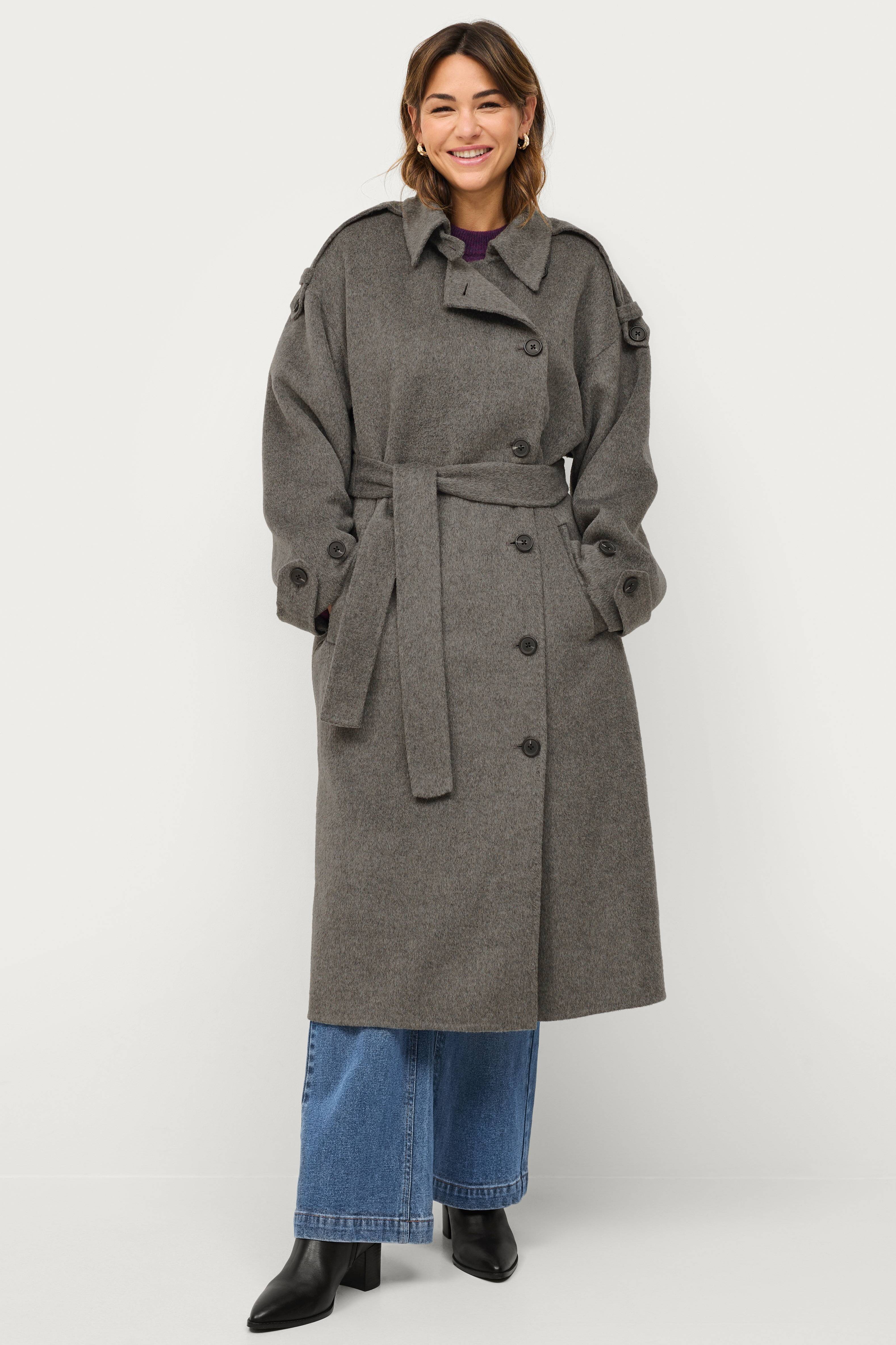 • Frakke i uldblanding med løs pasform• Blød, børstet struktur• Knapdetaljer på hver skulder• Lukning med knapper• Aftageligt bindebælte ved taljen• Knapdetaljer ved manchetterne• Længde: 117 cm i størrelse S