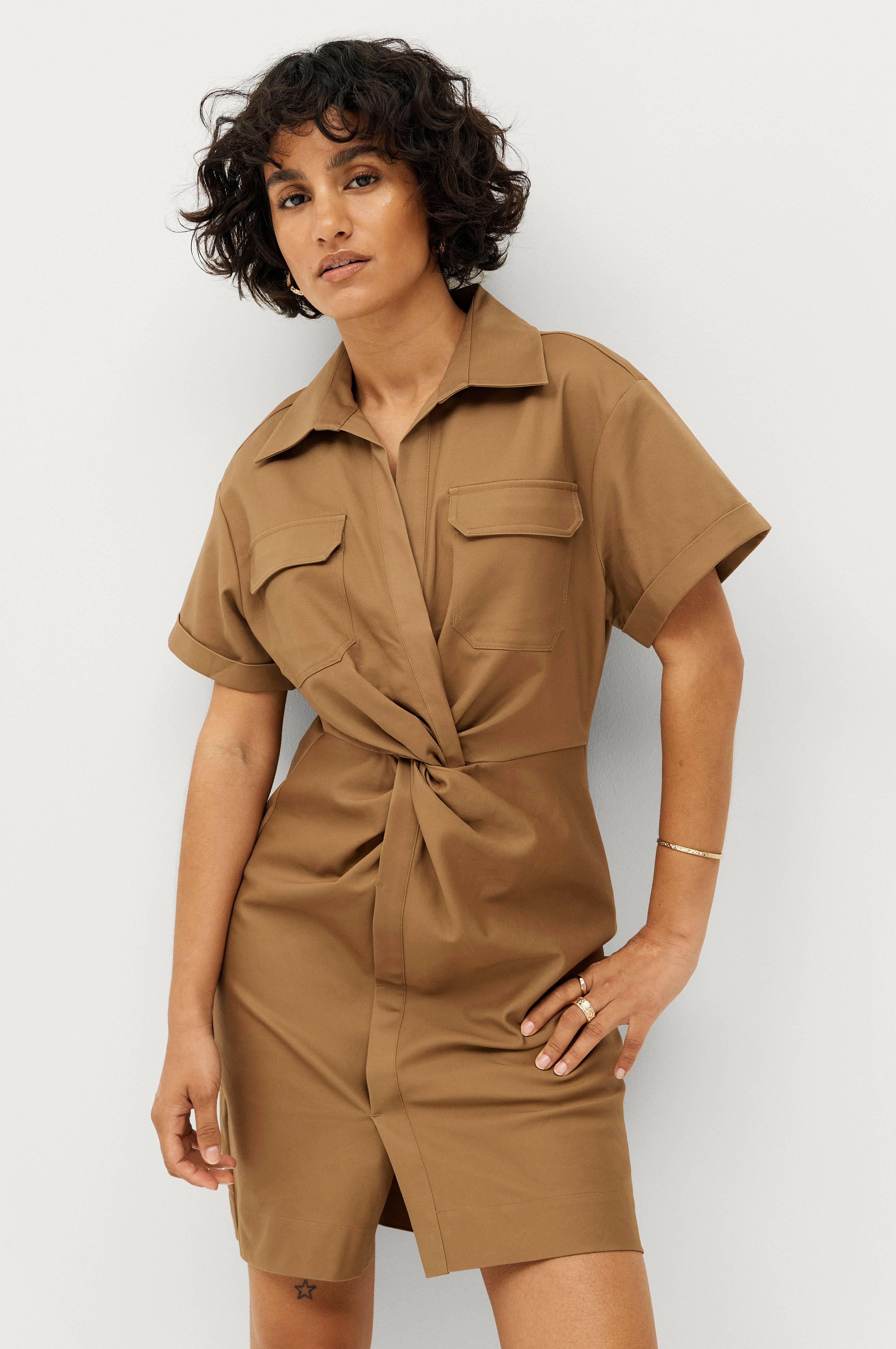 • Fremstillet af glat, elastisk bomuld• Spids krave• Korte ærmer med syede ærmeafslutninger• Knudedetalje ved taljen• To brystlommer med låg• Let figursyet pasform• Længde: 94 cm i størrelse S