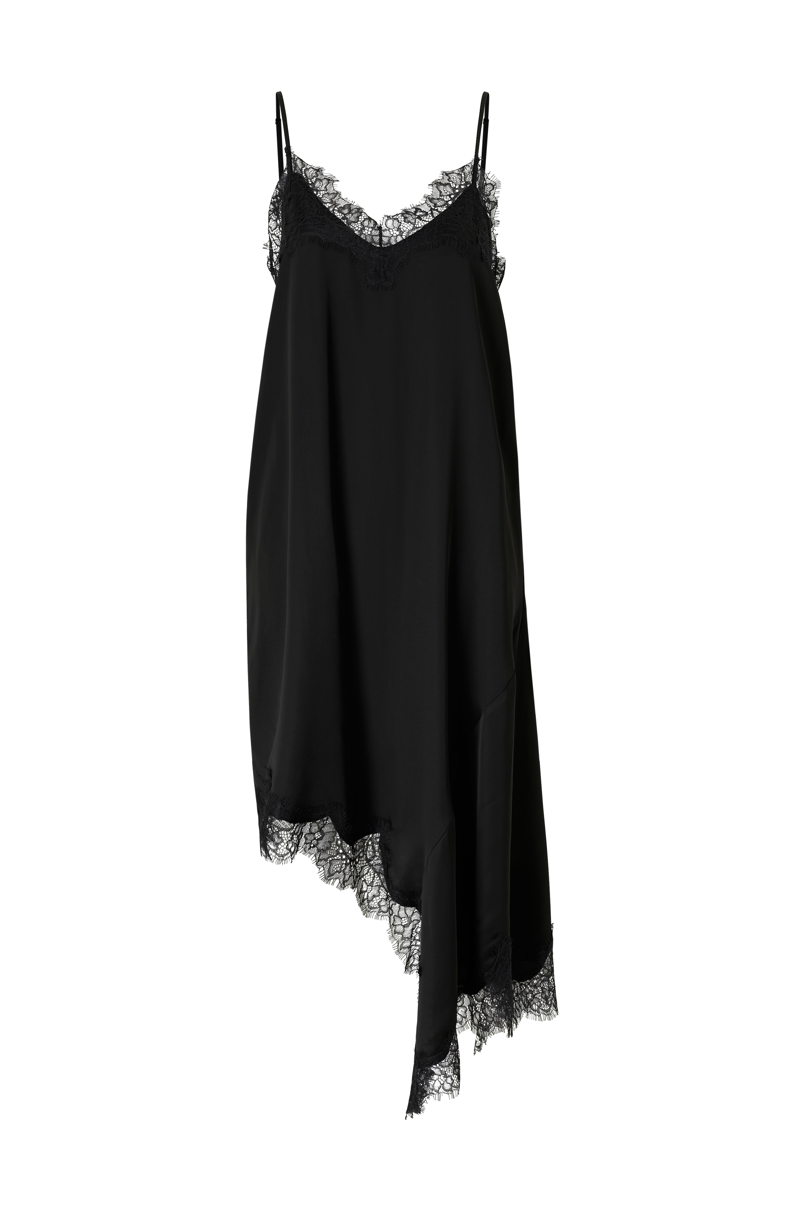 • Ærmeløs kjole i satin med tynde, justérbare skulderstropper• V-formet halsudskæring• Asymmetrisk søm• Påsyet blondekant på toppen og nederst• Længde: 95/129 cm i størrelse S