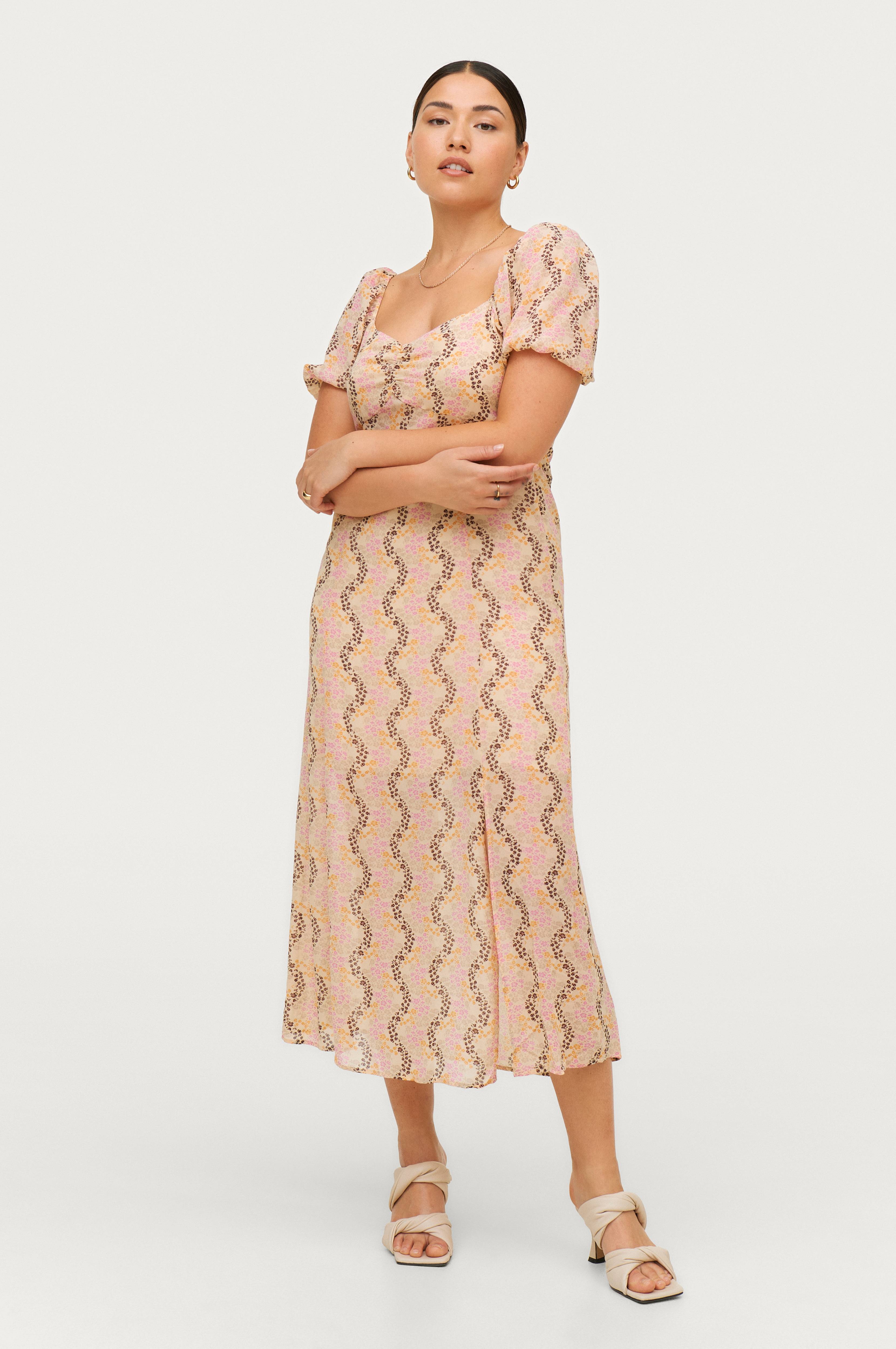 • Let viskose• Firkantet halsudskæring med elastisk bånd i siderne• Korte ballonærmer med elastik ved manchetterne• Smock oppe bagved• Vævet for• Slids i den ene side• Længde: 127 cm i størrelse S