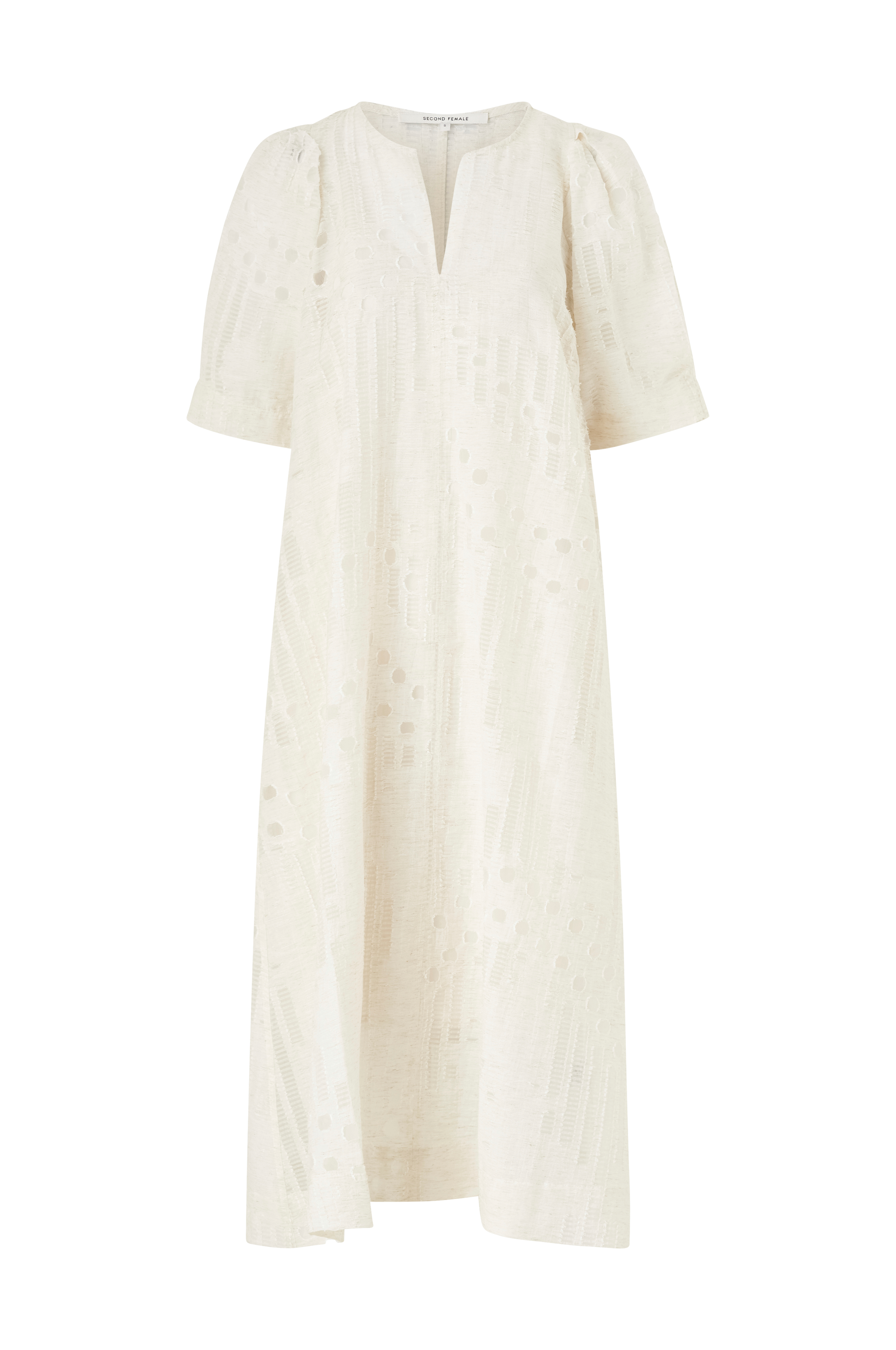 • Model med svaj• Lidt transparent, mønstervævet kvalitet• Rund hals med ventilation foran• Bredt ballonærme• Vævet, udtagelig underkjole med tynde, justérbare skulderstropper• Længde: 123 cm i størrelse S