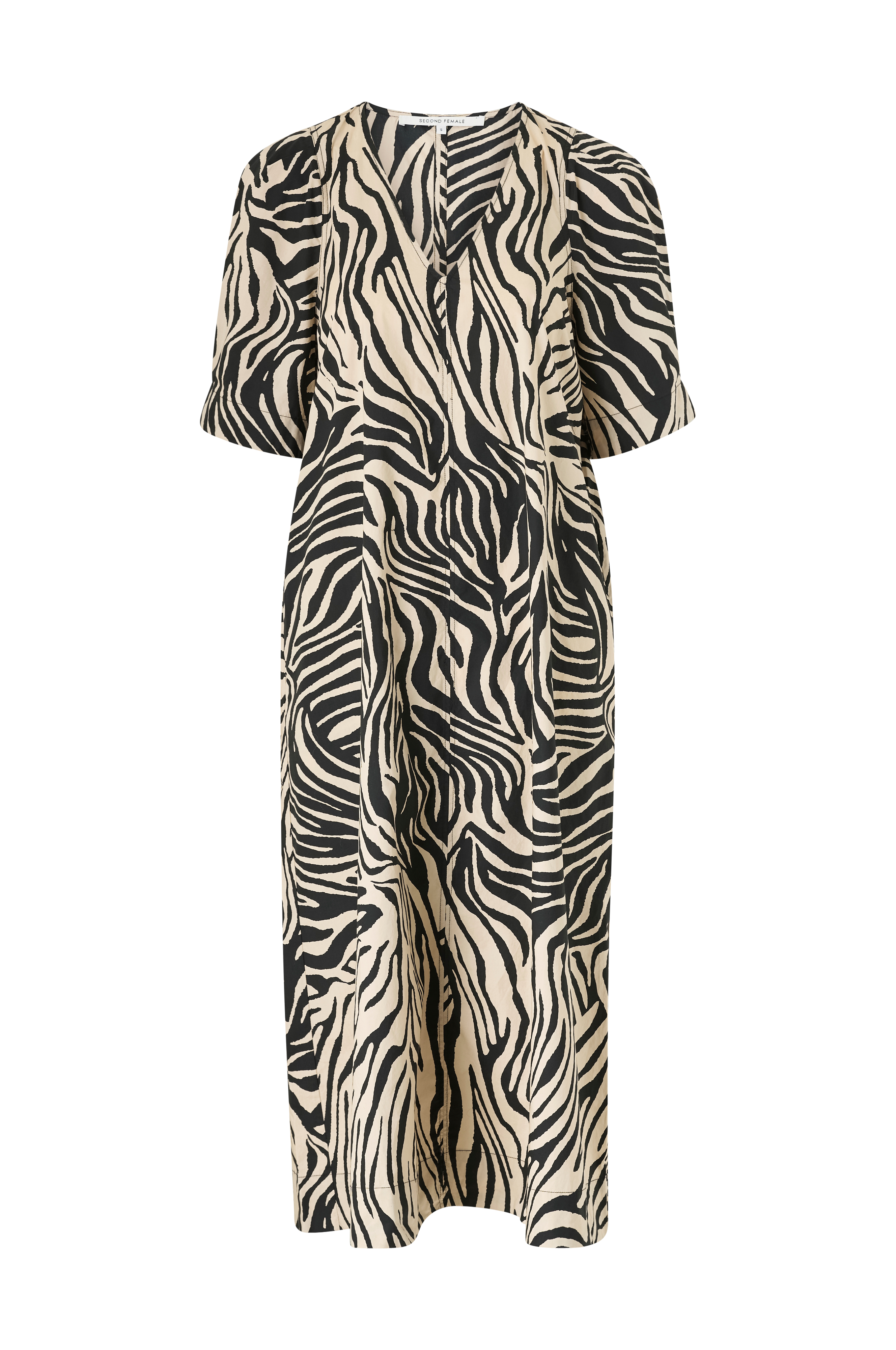 • Lang, A-facon kjole med v-formet halsudskæring• Korte ærmer med modfold• Sidelommer• Længde: 124 cm i størrelse S