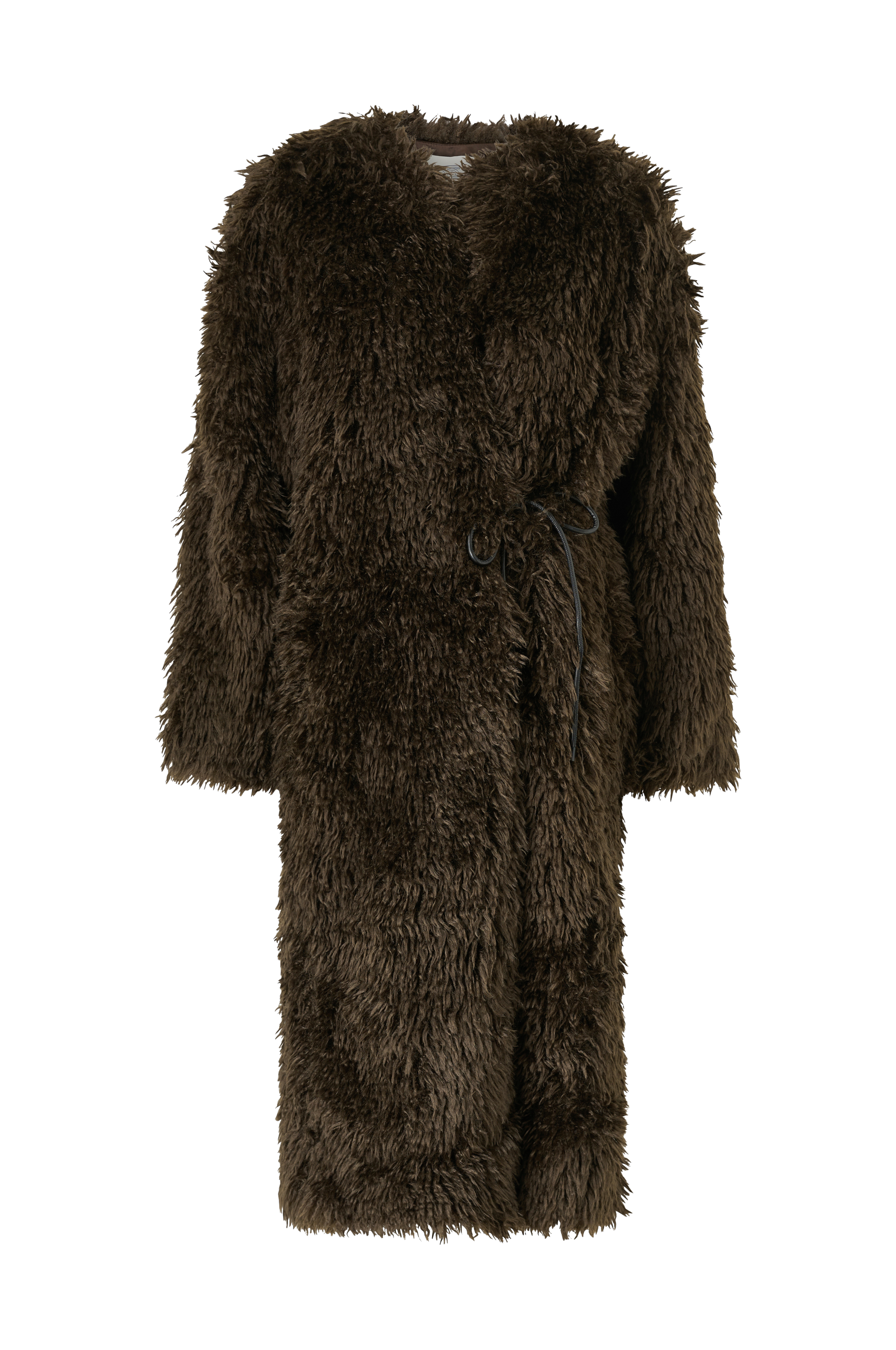 • Lang frakke i kunstskind• Snørelukning ved taljen• Skjulte sidelommer• Tekstilforing