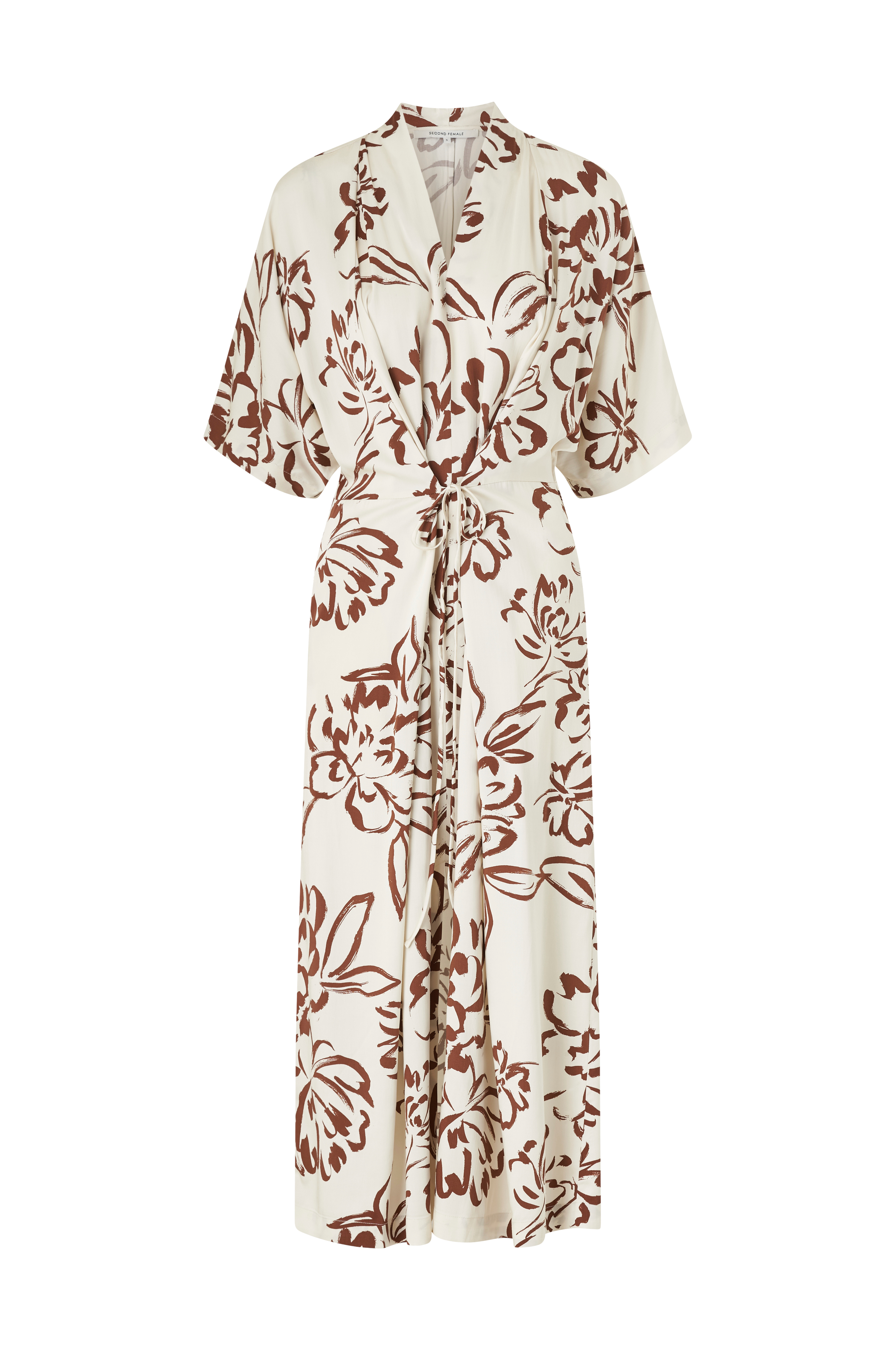 • Lang, mønstret kjole i viskoseblanding• V-udskæring• Korte ærmer• Bindebånd foran• Indlagte sidelommer• Slids midt foran• Længde: 135 cm i størrelse S