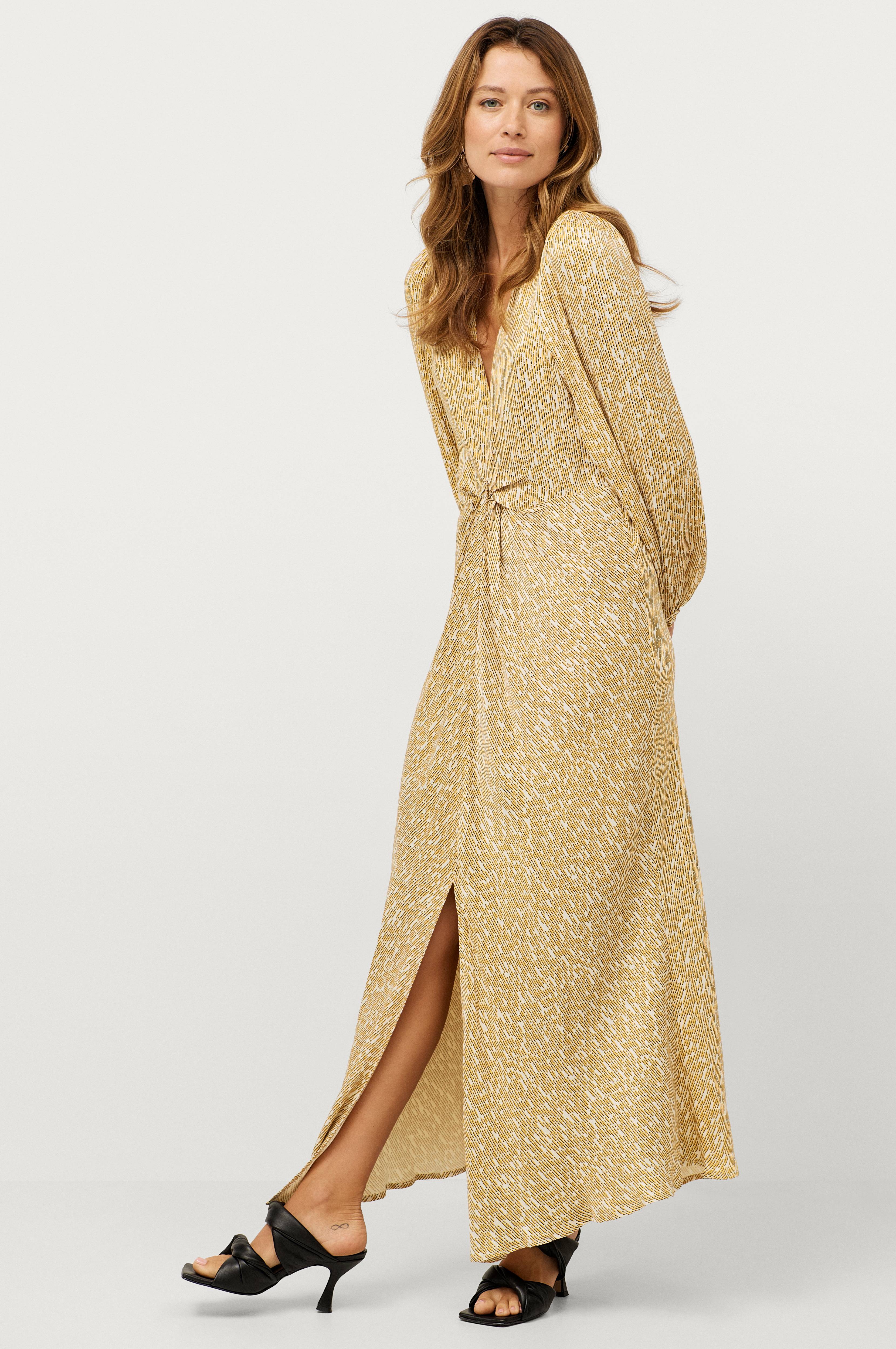 • Figurformede model med drapering foran på taljen• Dyb v-udskæring• Langt, bredt ballonærme med tynd manchet• Høj slids nede foran• Længde: 142 cm i størrelse S