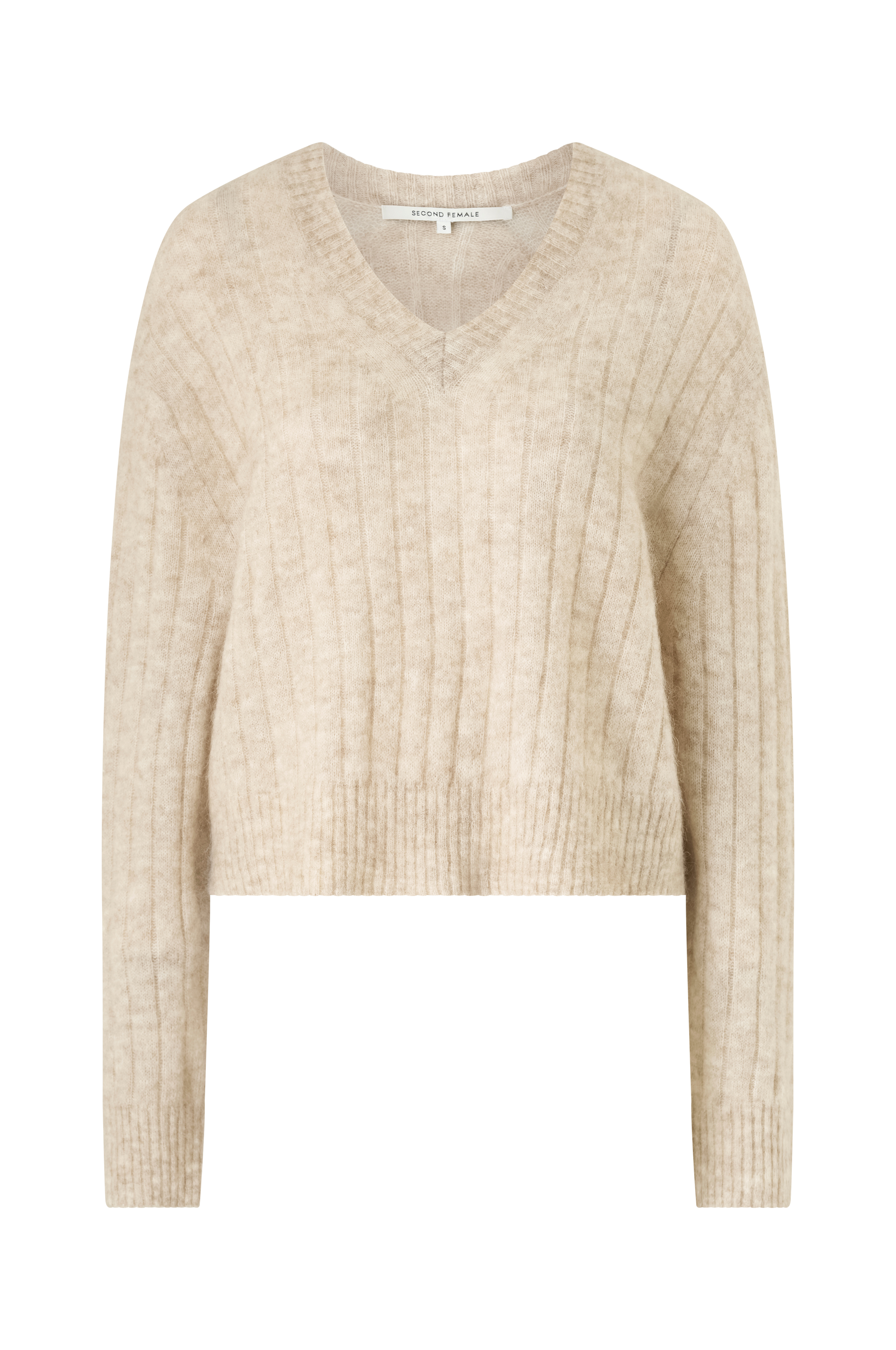 • Fintstrikket Pullover i mohairmiks• V-formet, ribbet halsudskæring• Lange ærmer med nedsænkede skuldre• Ribstrik ved manchetterne og ved nederste kant
