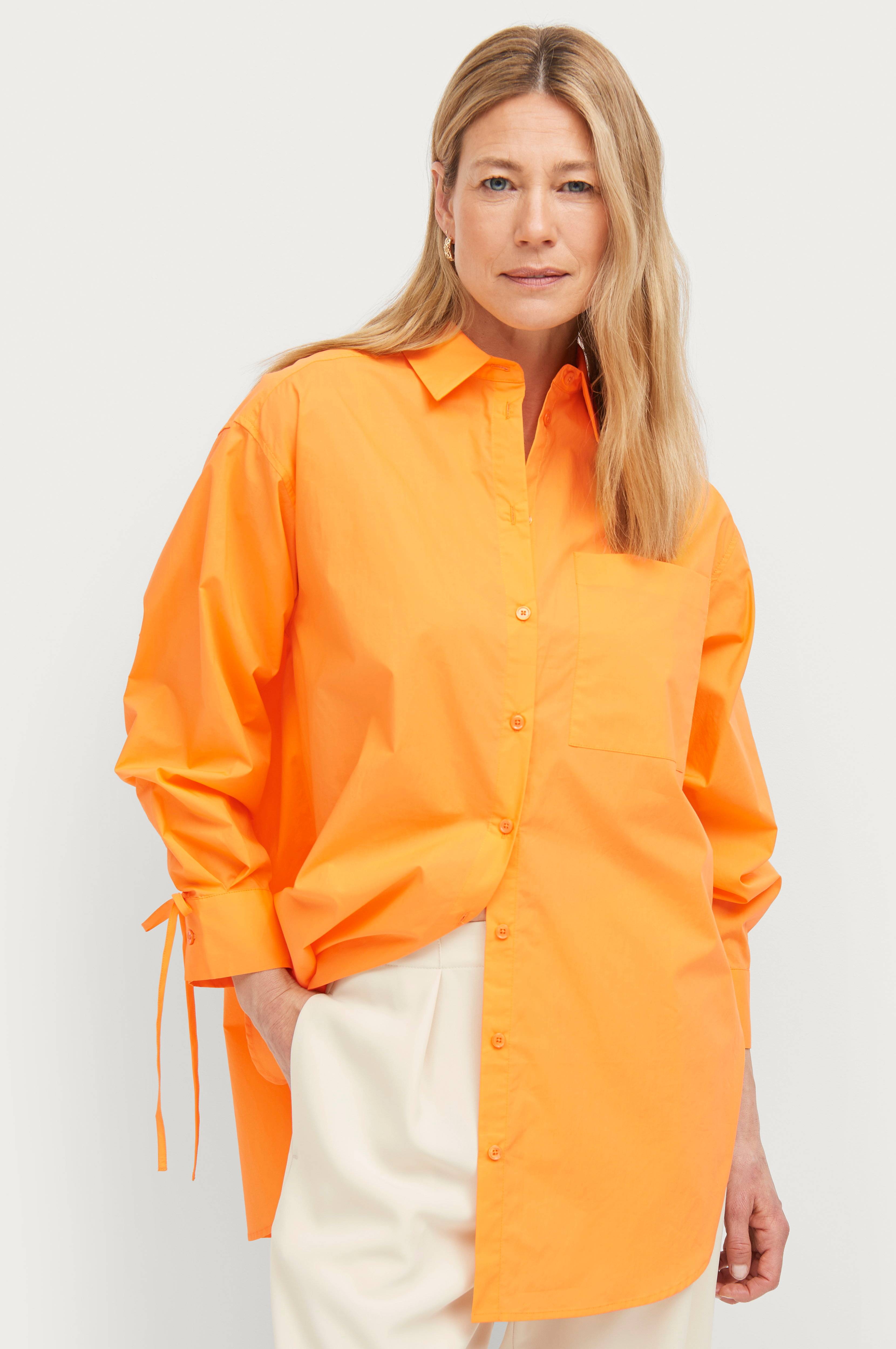 • Oversize model • Spids krave • Knapper • En brystlomme • Manchet med to knapper • Samling langs ærmerne • Bindebånd ved ærmeafslutningerne • Produktet indeholder økologisk bomuld, som er dyrket uden kemiske sprøjtemidler, kunstgødning og genmodificerede afgrøder (GMO). Dette betyder et sundere arbejdsmiljø for landmænd og bedre jord.