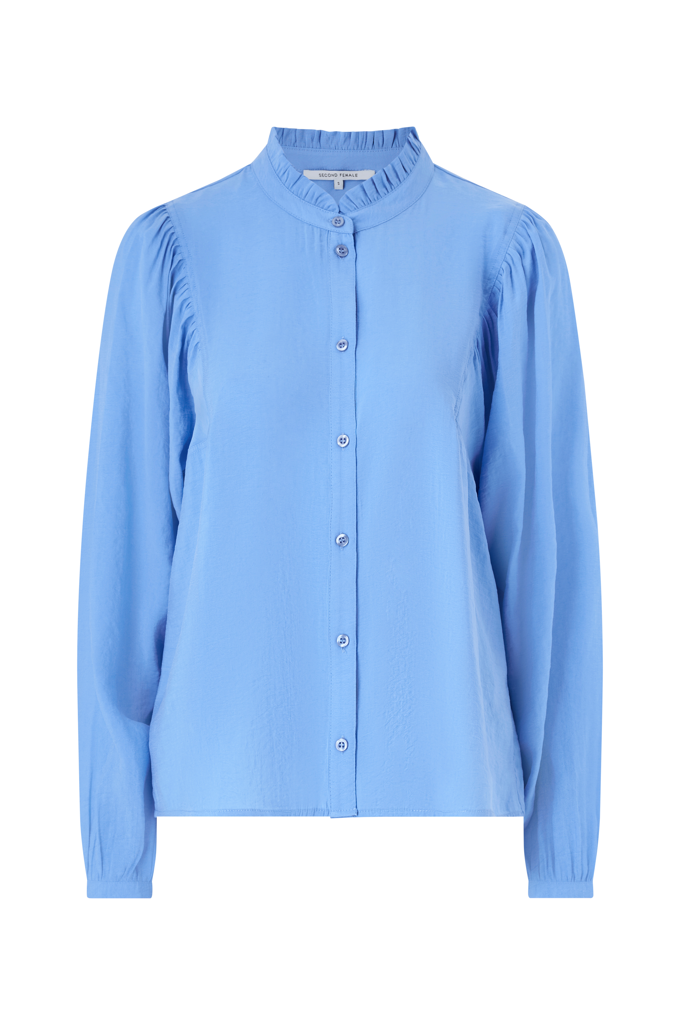 Skjorte i en blød og luftig modalblanding med en halvgennemsigtig kvalitet. Høj halsudskæring med flæsekant og gennemgående knaplukning. Firkantet skuldersøm med rynke. Lange ærmer med knappede manchetter. Piping på skuldre og ryg. Løs og luftig pasform.