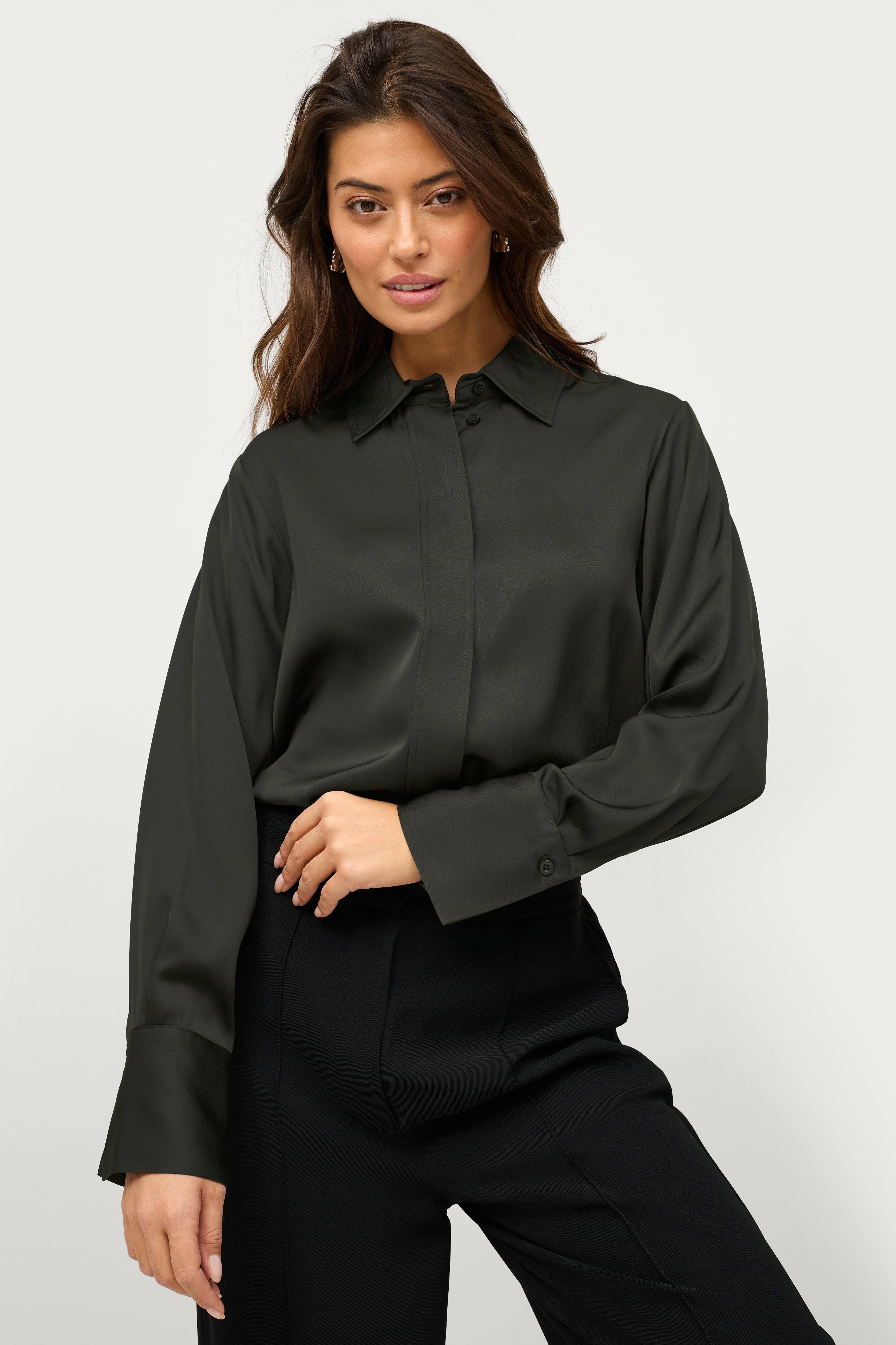 • Skjorte i ultrablød, glat viskose• Skinnende kvalitet• Krave• Skjult knapstolpe• Lange ærmer• Bred manchet med en knap og ventilation• Afslappet, luftig silhuet