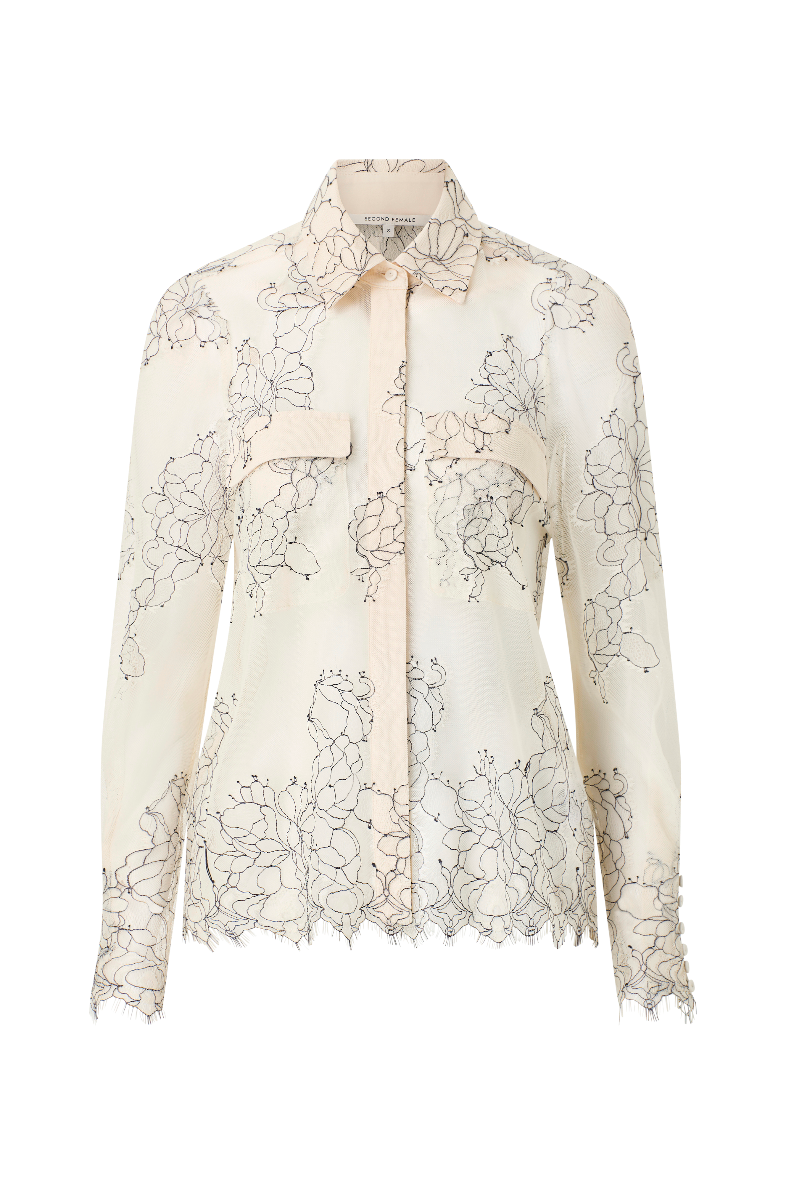• Transparent skjorte i mesh med blondedetaljer• Krave• Lange pufærmer• Knapper ved manchetterne• Skjult knaplukning• To brystlommer