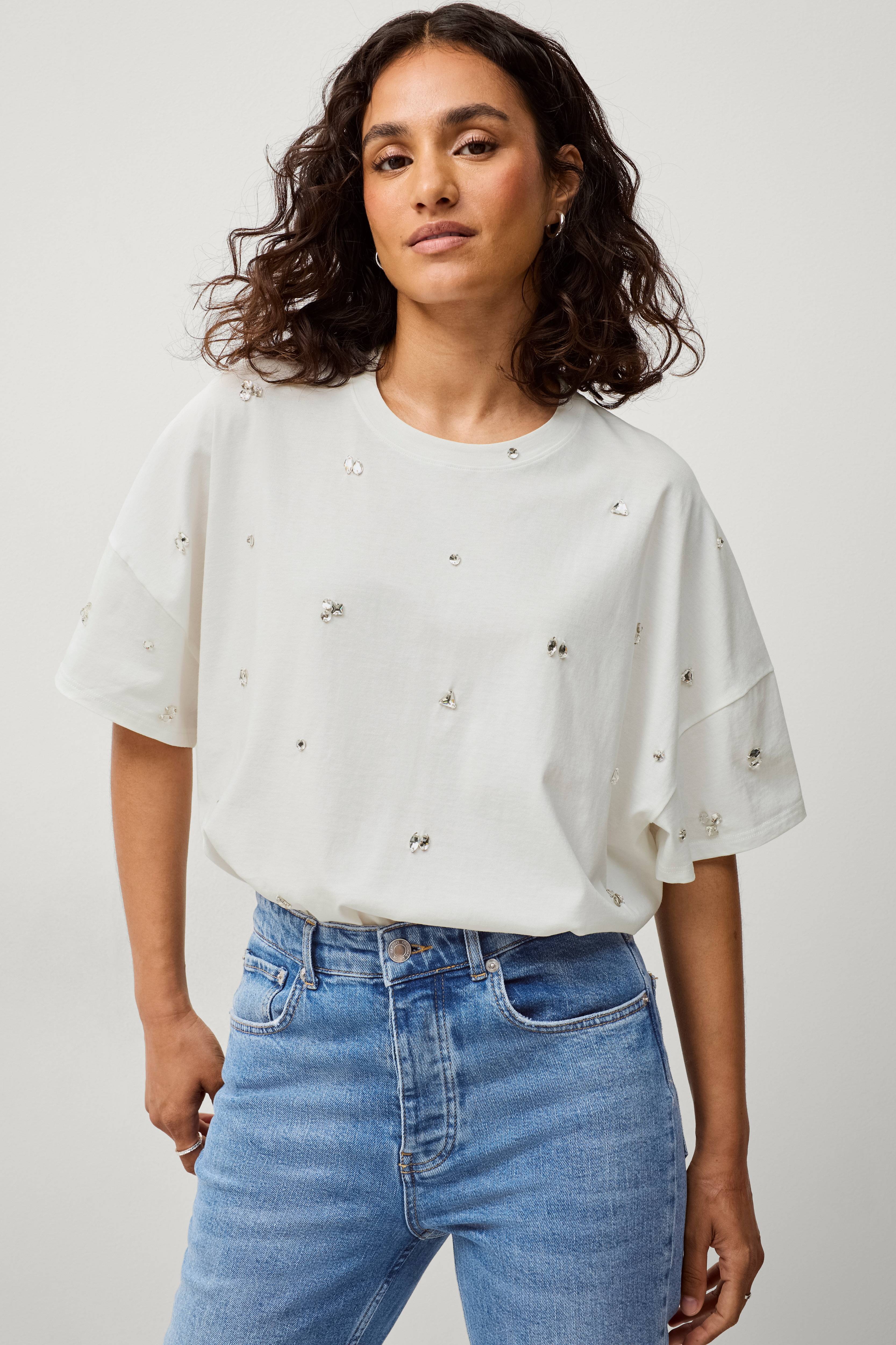 • T-shirt i bomuldsjersey• Skinnende glassten foran• Korte ærmer• Nedsænkede skuldre• Afslappet pasform• Ventilationer nede i siderne
