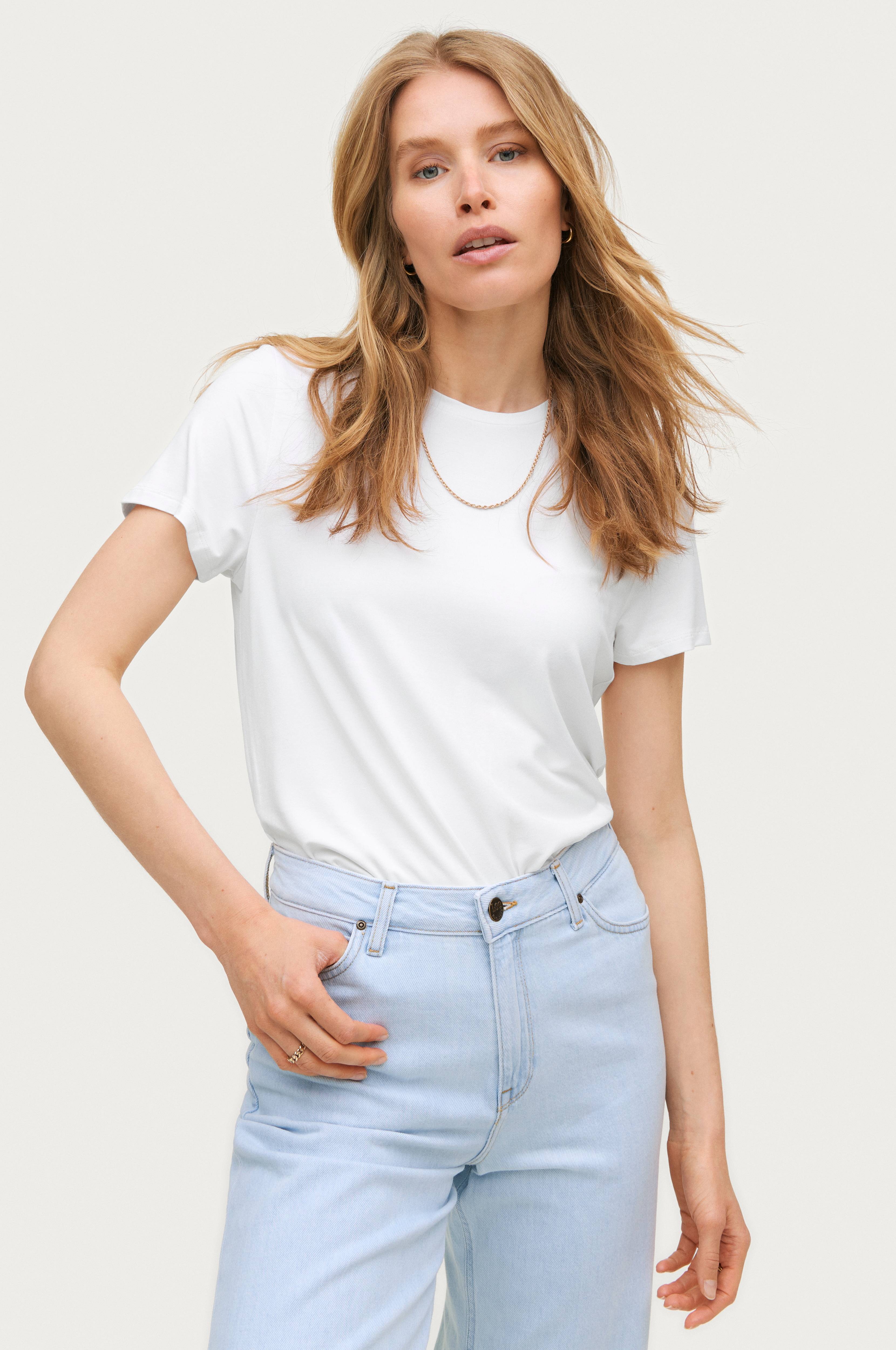 • Lige model• Kort ærme• Rund, ribstrikket halsudskæring