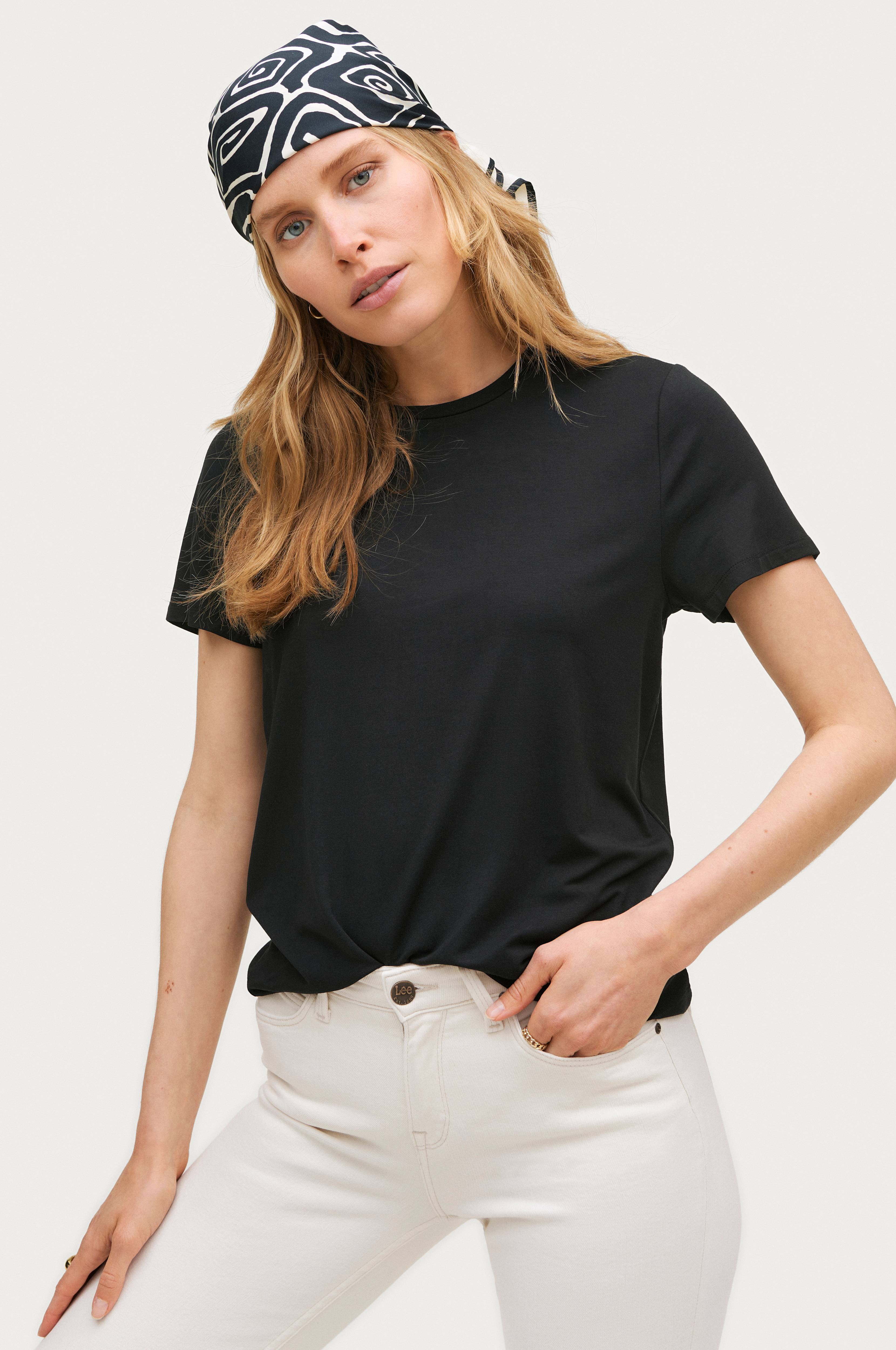 • Lige model• Kort ærme• Rund, ribstrikket halsudskæring