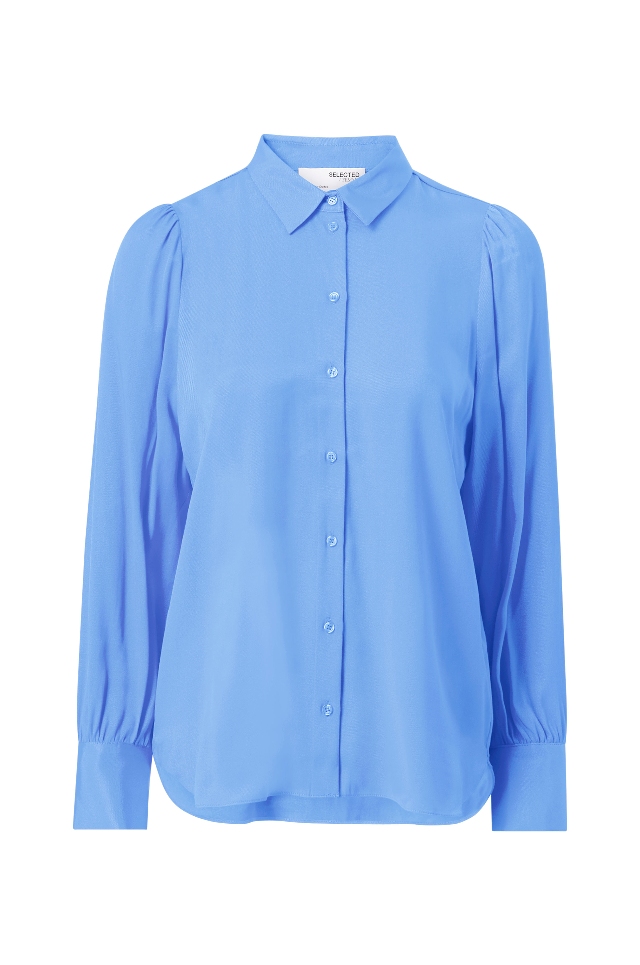 Skjortemodel med lille krave og knapper hele vejen foran. Langt pufærme med bred manchet i ærmekant. Afrundet kant forneden med slids i siderne.