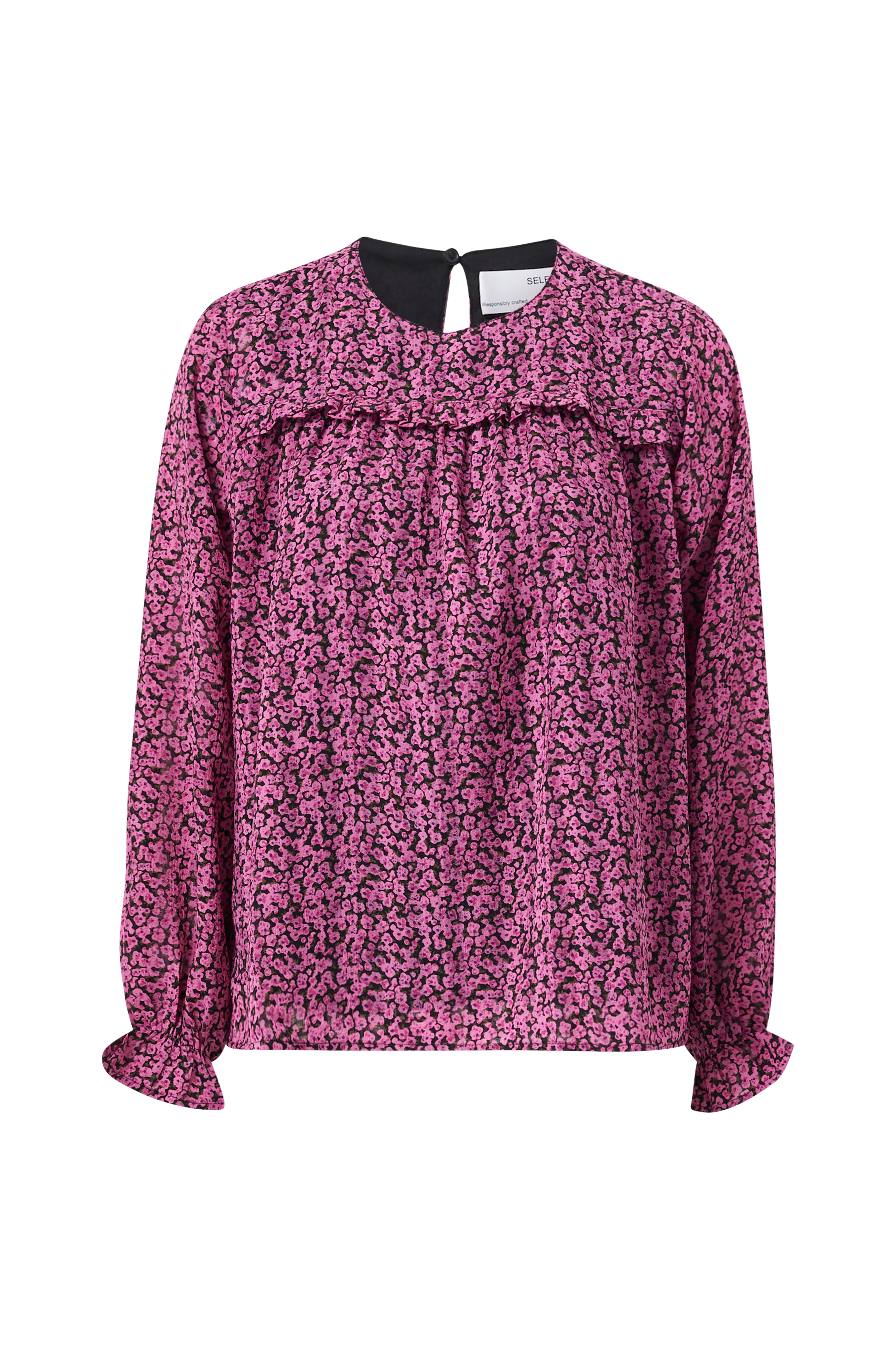 • Bred model i chiffon • Rund hals med knap i nakken • Lille volant på toppen • Bredt ærme med elastisk bånd nederst • Trikotfor • Produktet indeholder genindvundet materiale, som genbruges for at reducere mængden af affald samtidigt med at der ikke anvendes nye ressourcer.