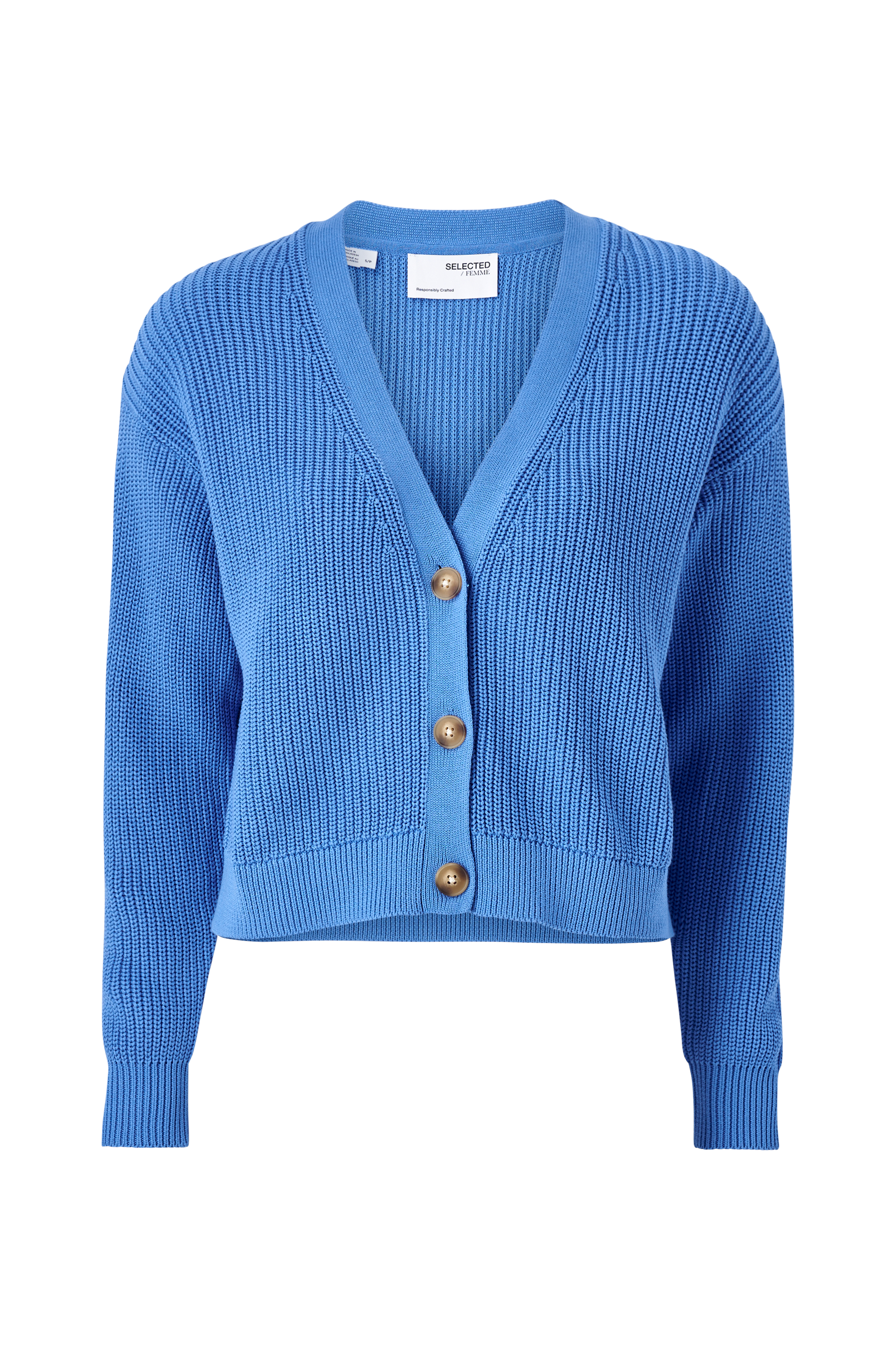• Strikket cardigan i bomuld• V-udskæring• Knapper foran• Firkantet pasform• Nedsænkede skuldre