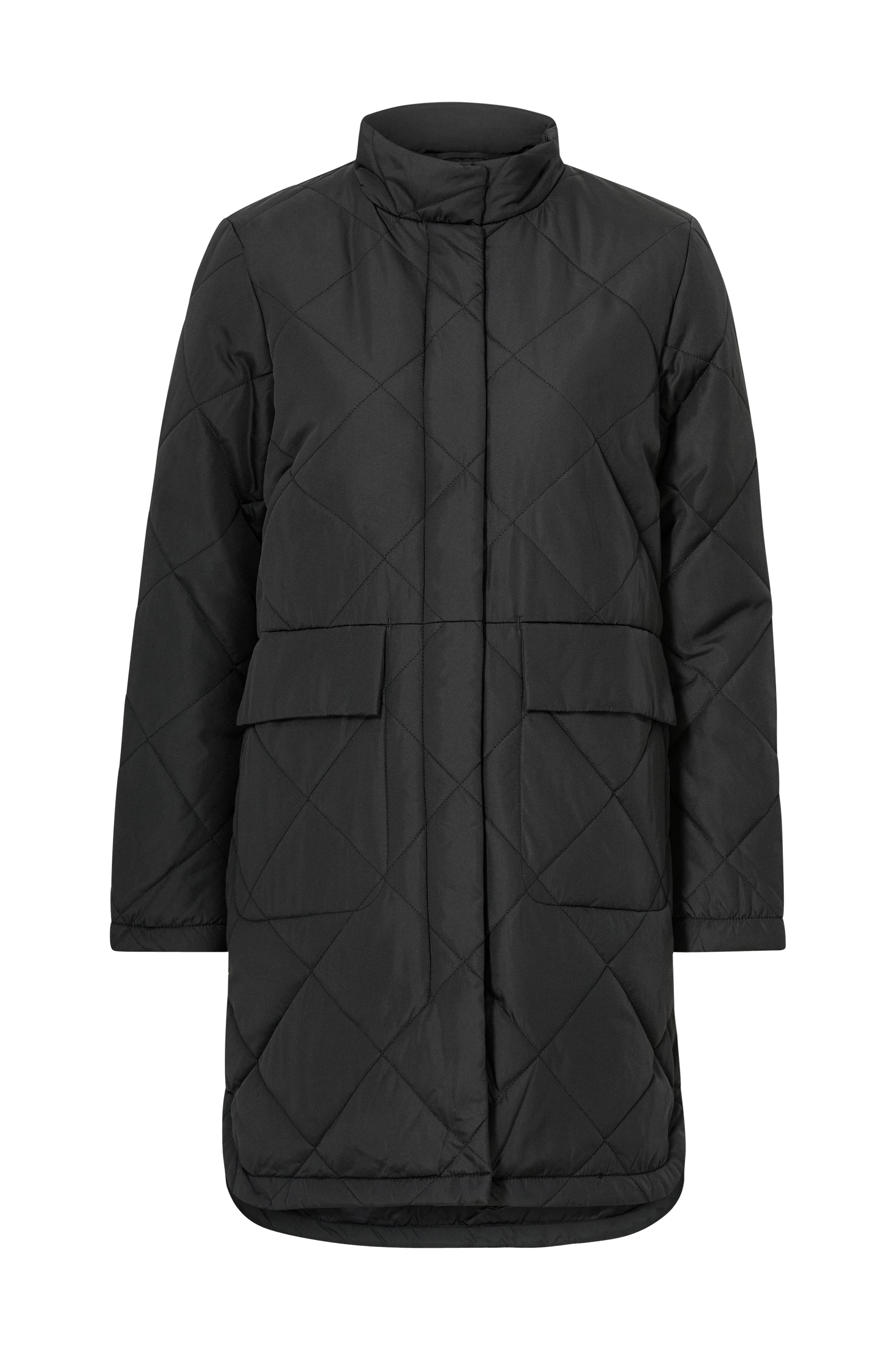 Quiltet jakke med tynd vattering. Lige model med lynlås og overfald med trykknapper foran. To store lommer med klap. Sideslids forneden. Længde ca. 90 cm i str. 36.