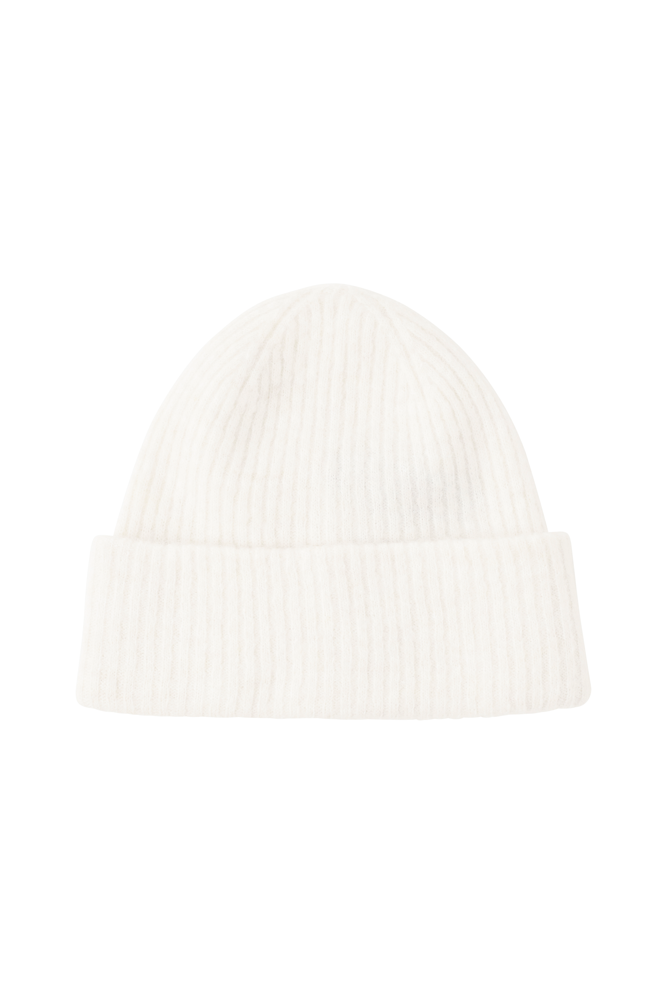 • Strikket hue i blød merinouldblanding• Foldet søm