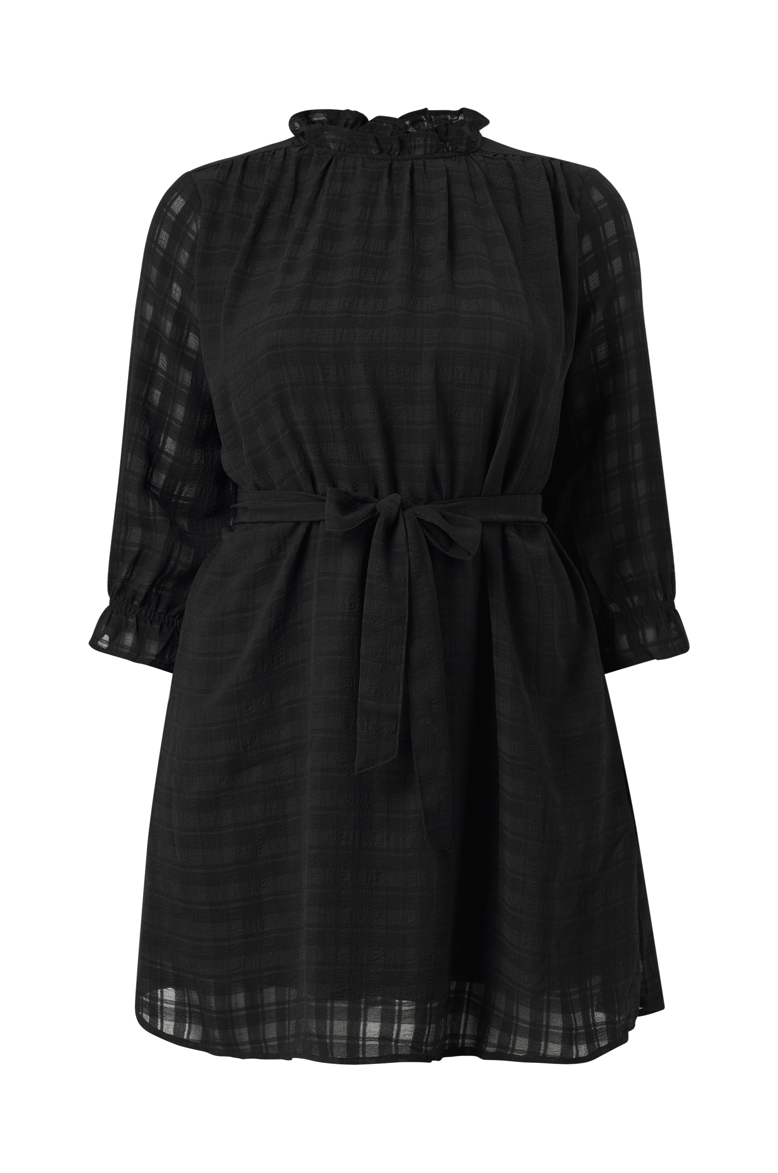 • Kort kjole med A-linje design • 3/4 lange ærmer med volant • Rund hals med volant • Bindebånd i nakken • Bindebælte ved taljen • Trikotfor • Længde: 92 cm i størrelse 36 • Produktet indeholder genindvundet materiale, som genbruges for at reducere mængden af affald samtidigt med at der ikke anvendes nye ressourcer.