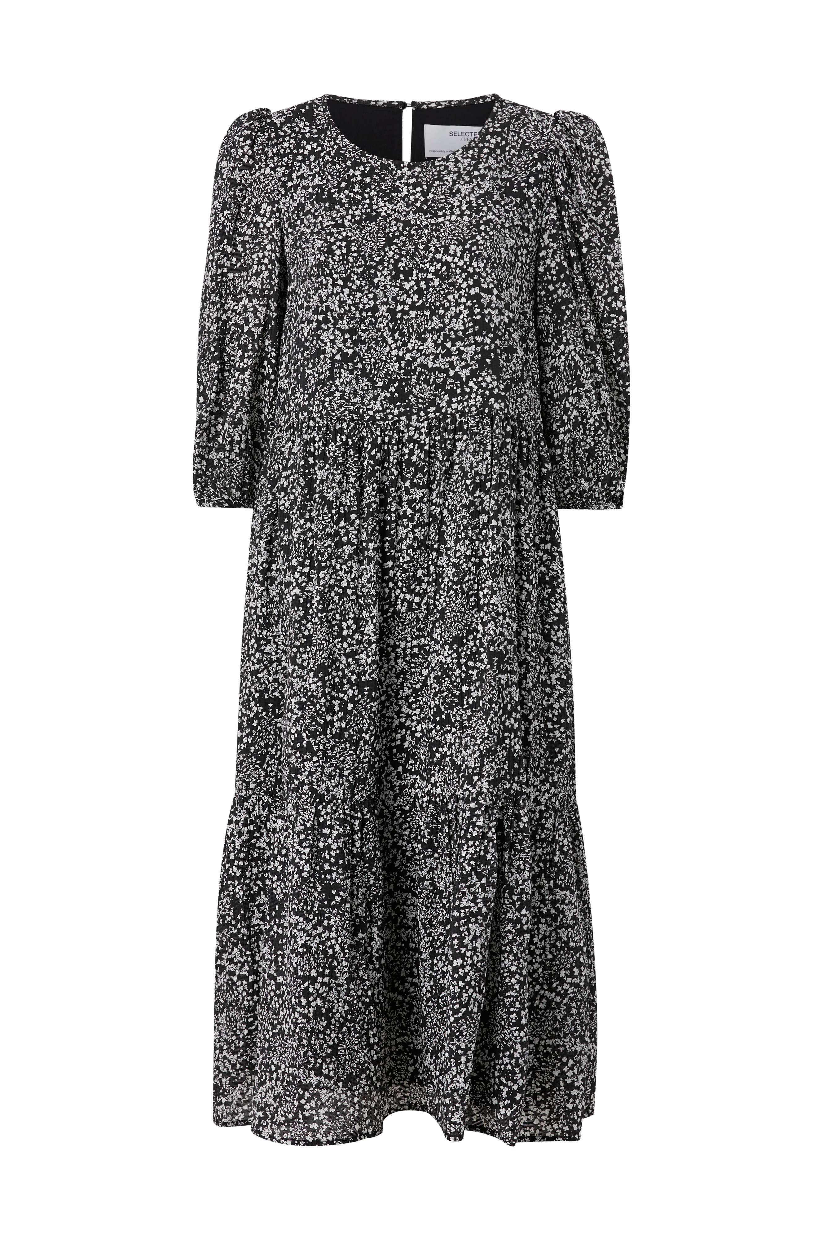 • Læglængde model • Rund hals med ventilation og knap bagpå • 3/4 lange ballonærmer med elastiske ærmeafslutninger • Rynket talje • Nederdel med svaj med volant • Kreppet kvalitet • Foret • Længde: 120 cm i størrelse 36