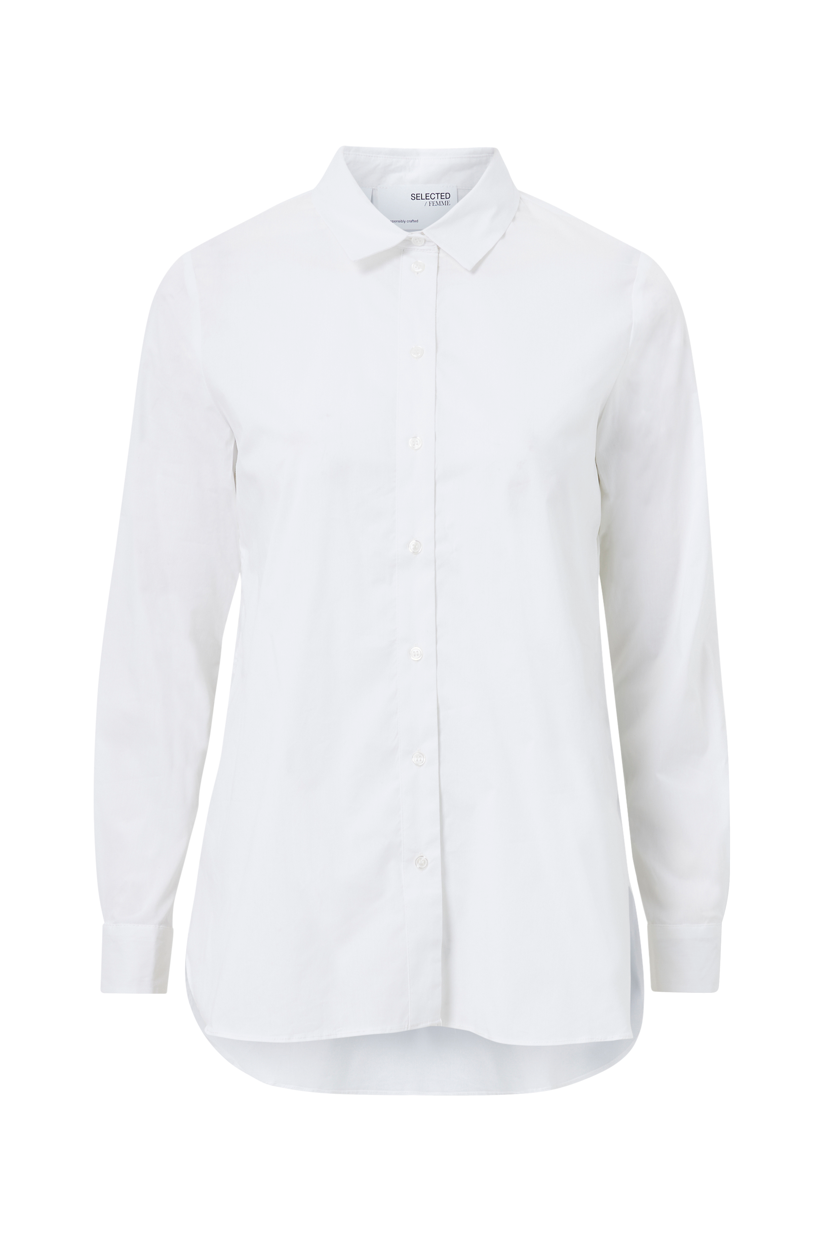 A-formet model i løst snit med afrundede slidser forneden i siderne som har lange, skjulte lynlåse. Lille krave og lukning foran samt manchet i ærmekant.