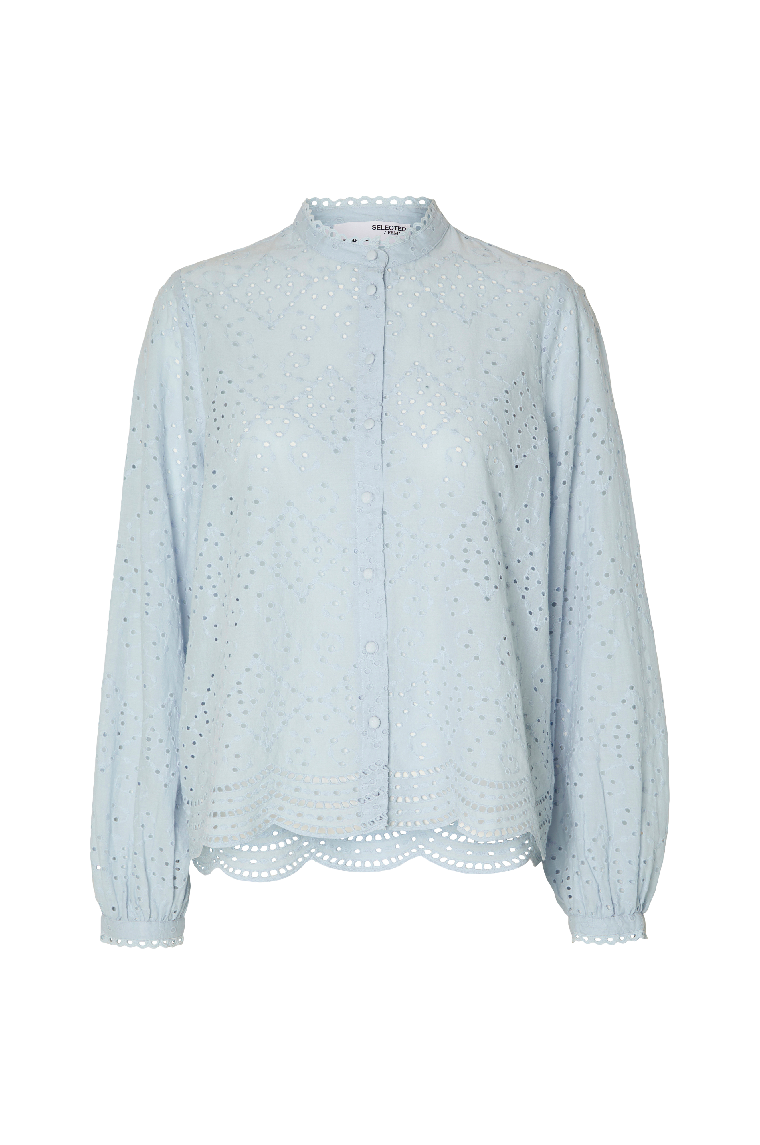 • Skjorte med broderet hulmønster• Beklædte knapper foran• Tynd manchet ved manchetterne