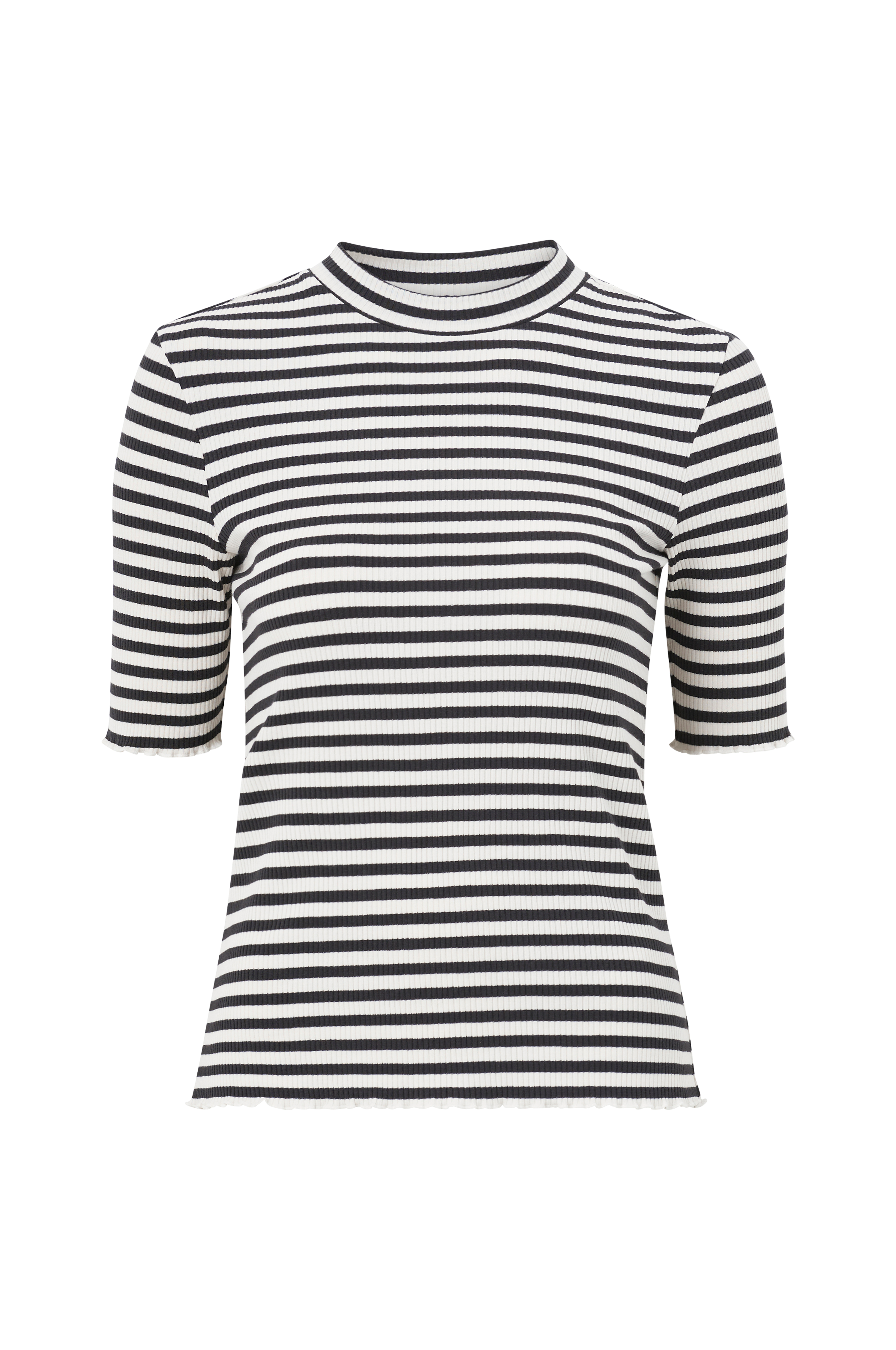 Kropsnær top i ribstrikket jersey med indvævede striber. Rund hals med påsyet kant samt bølget kant forneden og i ærmekant.