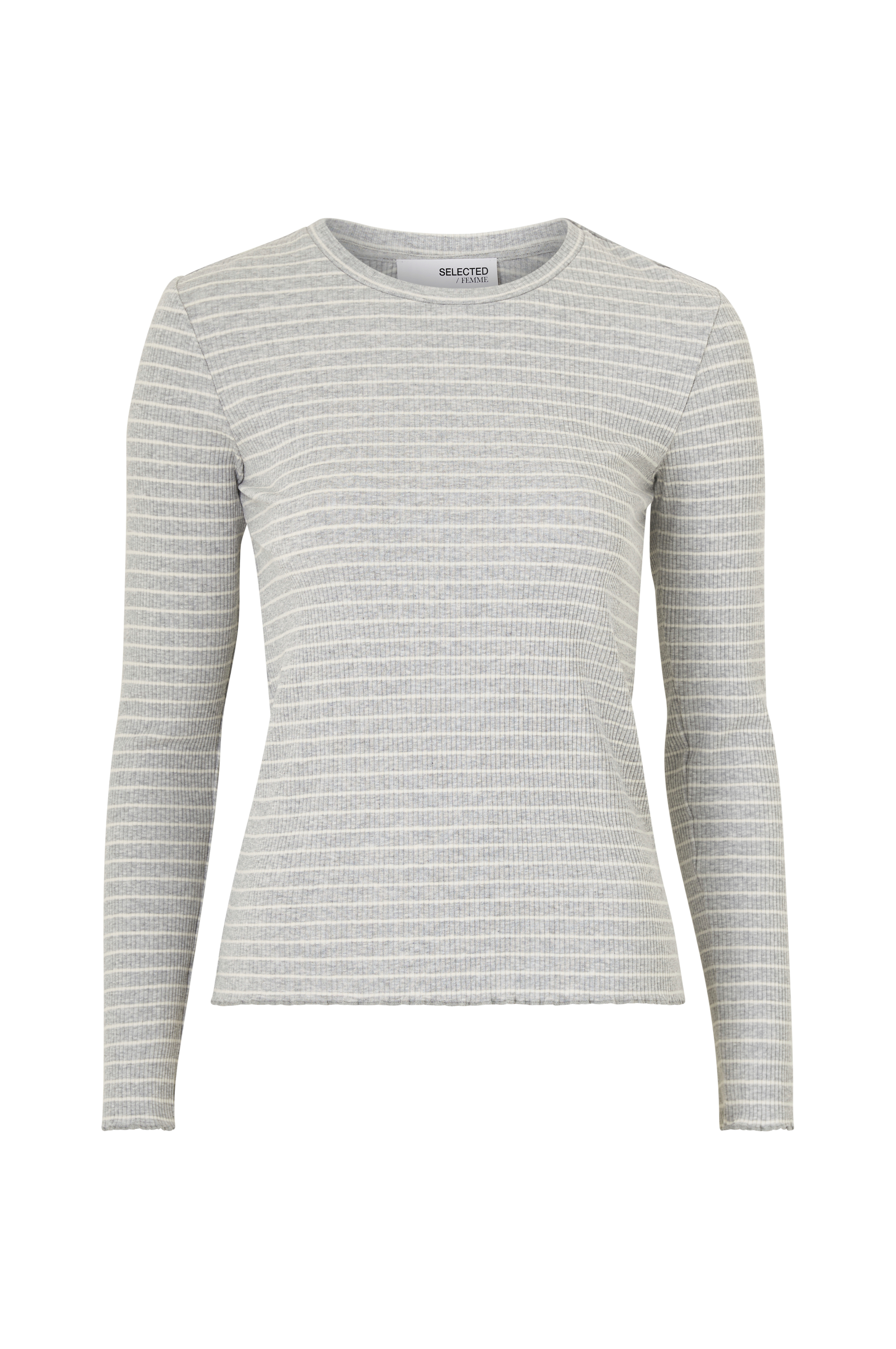 Stribet top i jerseyrib af økologisk bomuld. Kropsnær model med lange ærmer og bølget kant forneden og i ærmekanterne.