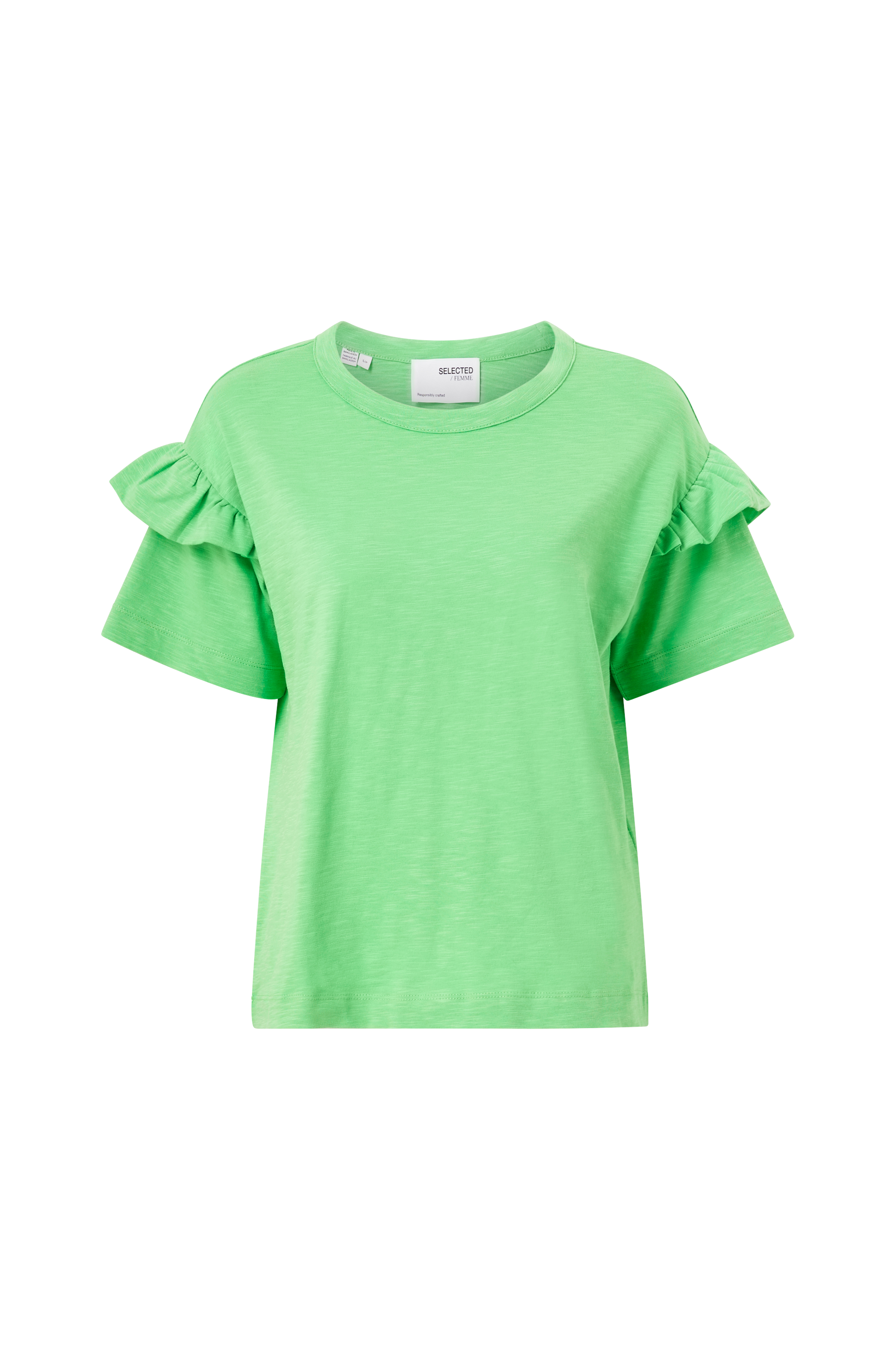 • Kort ærme med volant • Rund hals • Chunky jersey med struktur • Produktet indeholder økologisk bomuld, som er dyrket uden kemiske sprøjtemidler, kunstgødning og genmodificerede afgrøder (GMO). Dette betyder et sundere arbejdsmiljø for landmænd og bedre jord.