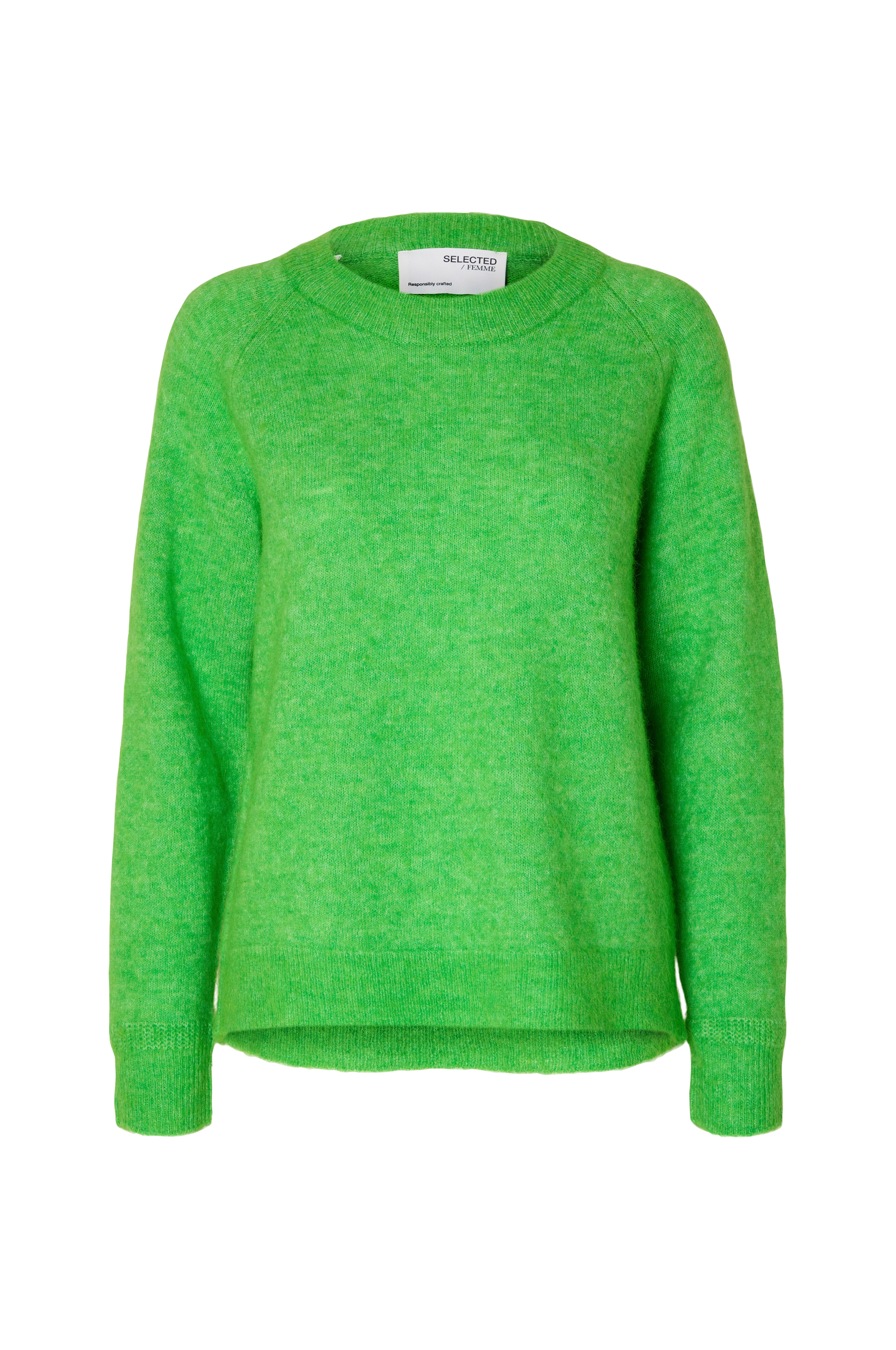 Trøje slfLulu LS Knit O-neck fra Selected Femme. Lige model i løst snit af blød finstrikket uldblanding. Rund hals med dobbelt ribkant samt raglanskåret ærme med ribstrik i ærmekant. Også ribstrik i kanten forneden.