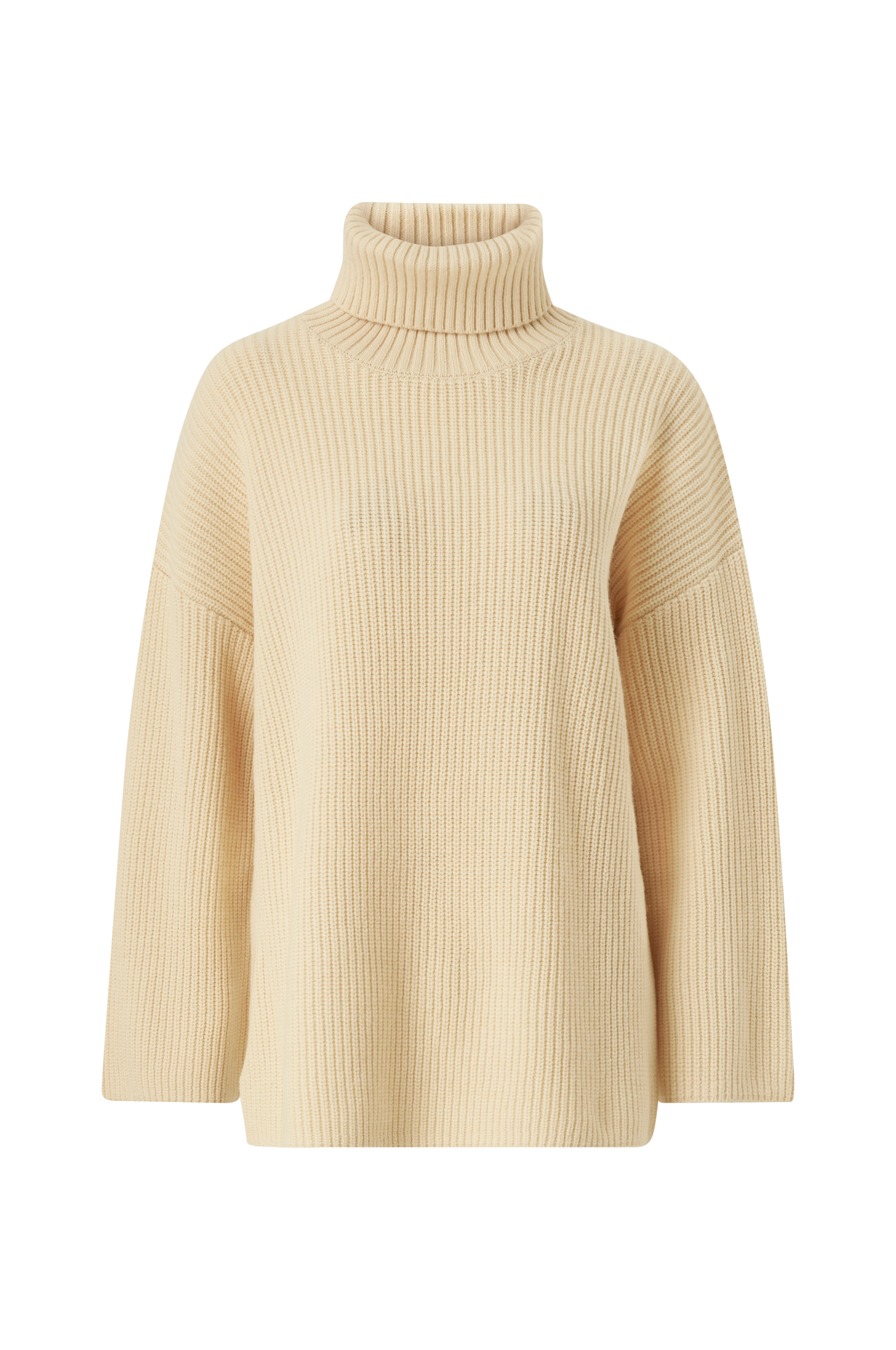 • Ribstrikket oversize model• Ribstrikket krave• Nedsænket skulder med lige, bredt ærme• Høj slids nede i siderne