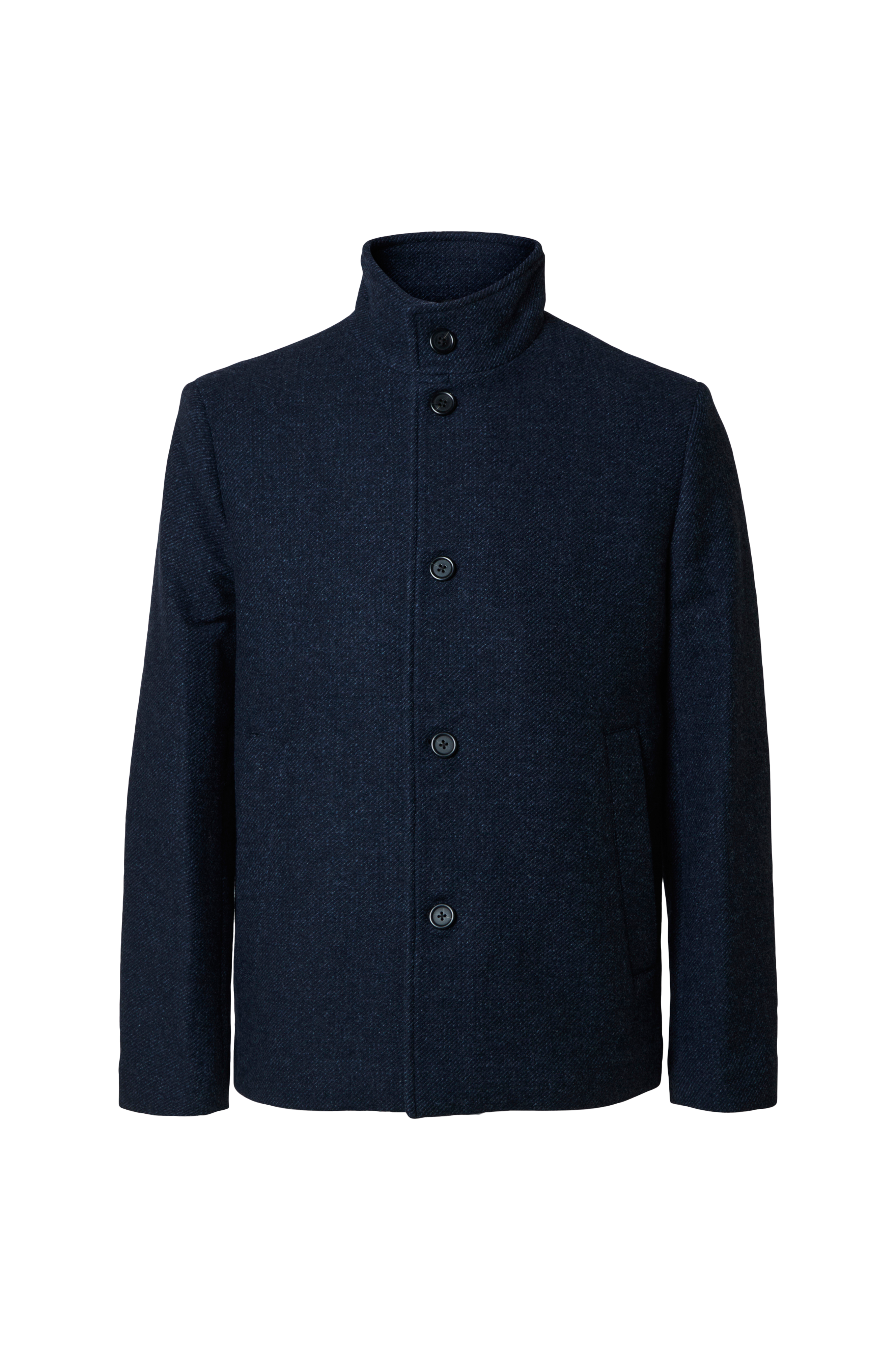 • Jakke i uldmiks med opretstående krave• Knaplukning• Sidelommer• To inderlommer med knap• Vævet for• Længde: 72 cm i størrelse M