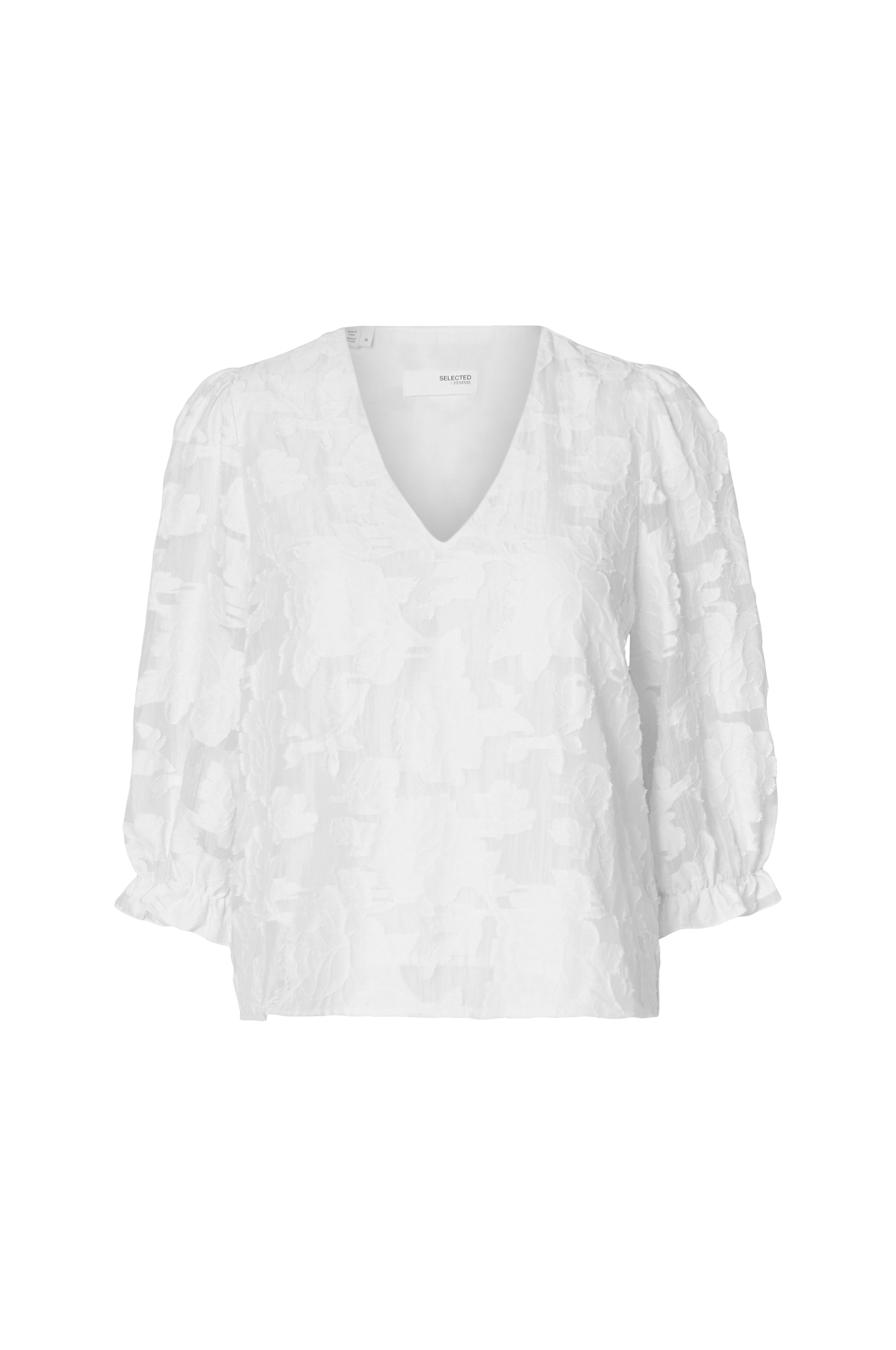 • V-udskæring• 3/4 lange ballonærmer med volant ved manchetterne• Transparent materiale med vævet mønster• Tyndt for