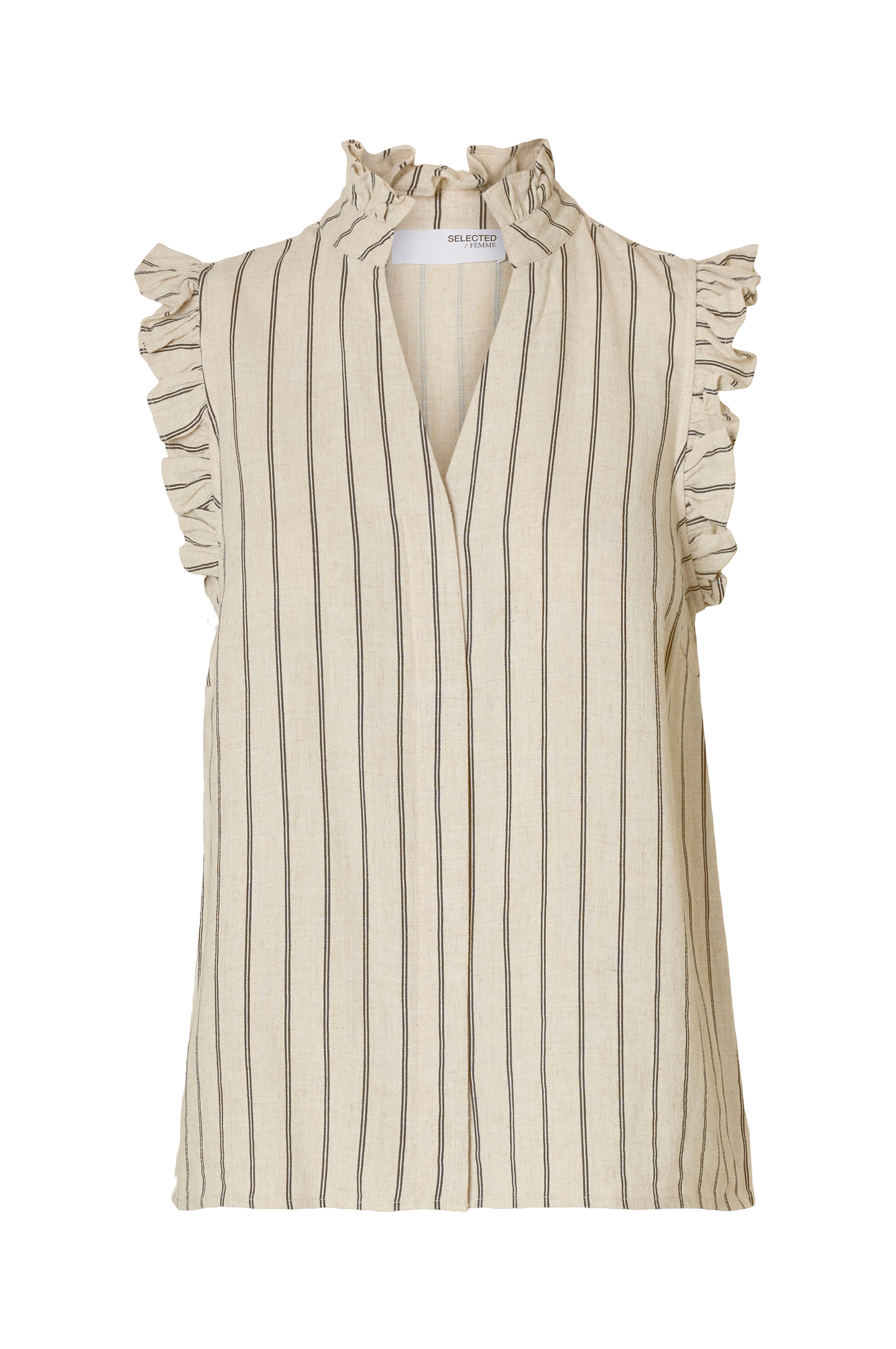 • Bluse i viskose med struktur i hør• V-udskæring• Flæsekrave• Korte flæseærmer• Skjult knaplukning foran