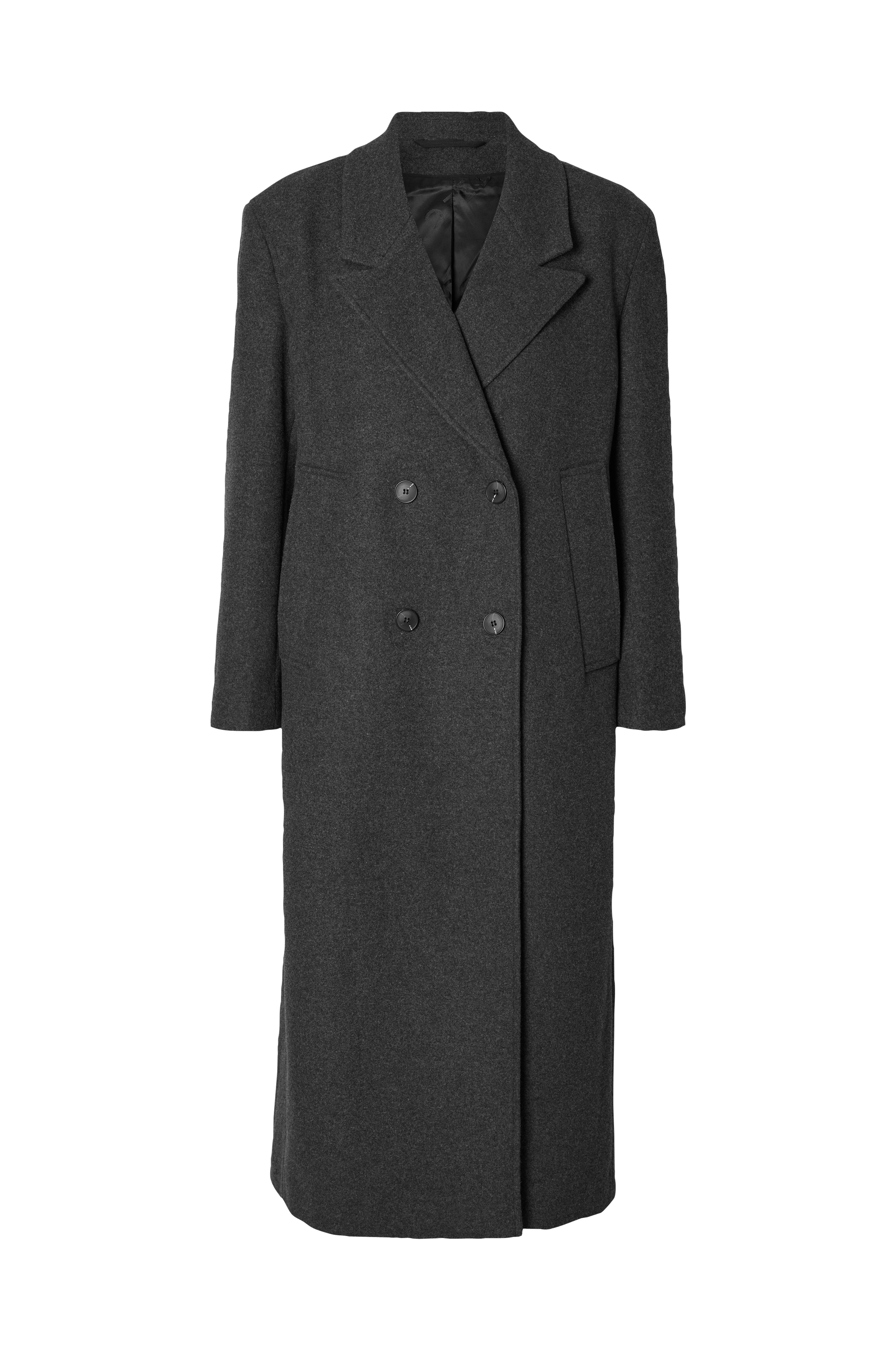 • Lang frakke i uldblanding• Dobbeltbrystet model• To yderlommer• En inderlomme• Slids nede bagved• Vævet, glat for• Længde: 121 cm i størrelse 36