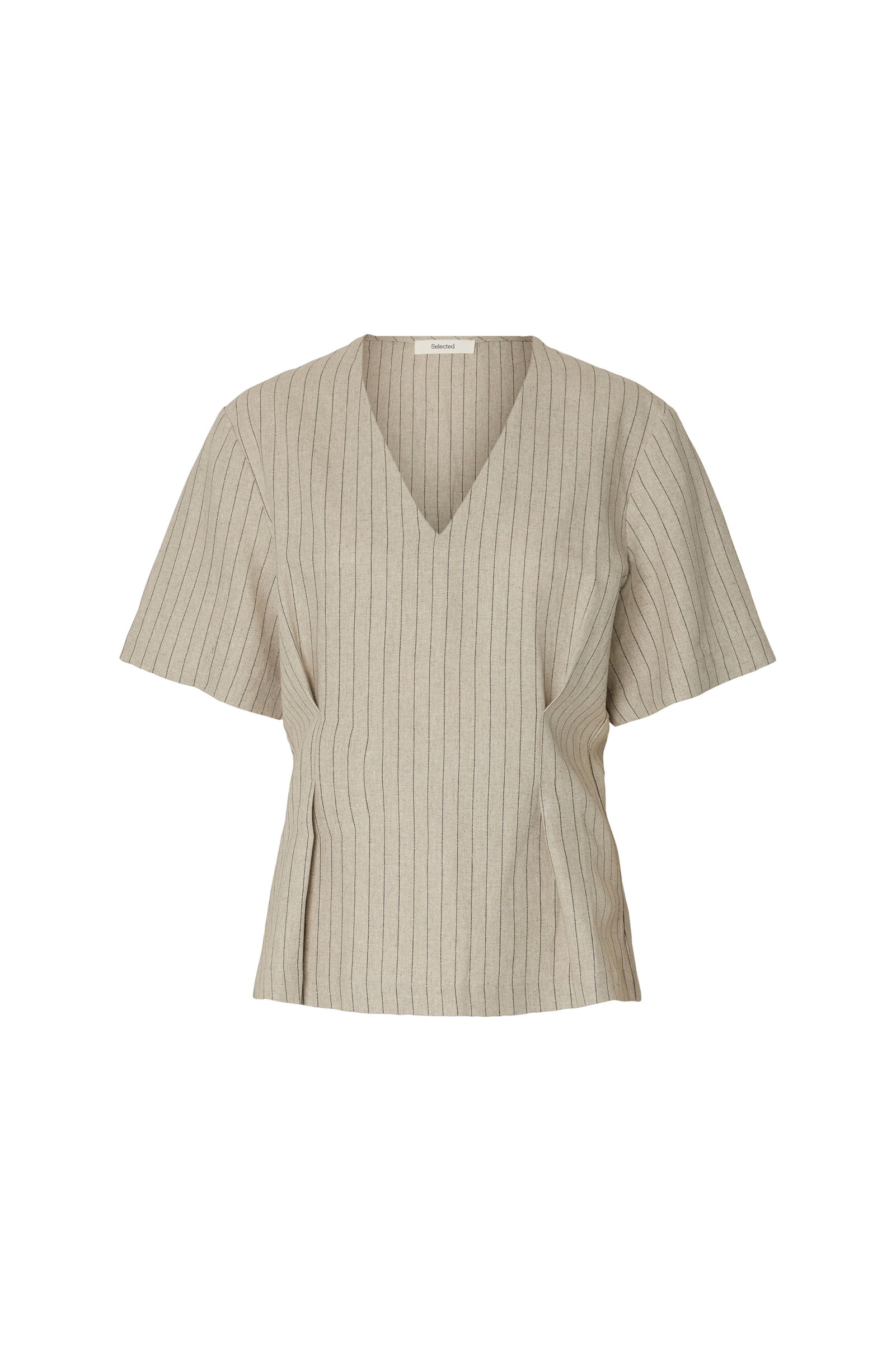 • Bluse i hørblanding• V-formet halsudskæring• Korte ærmer• Indsnit foran på taljen med smock bagpå