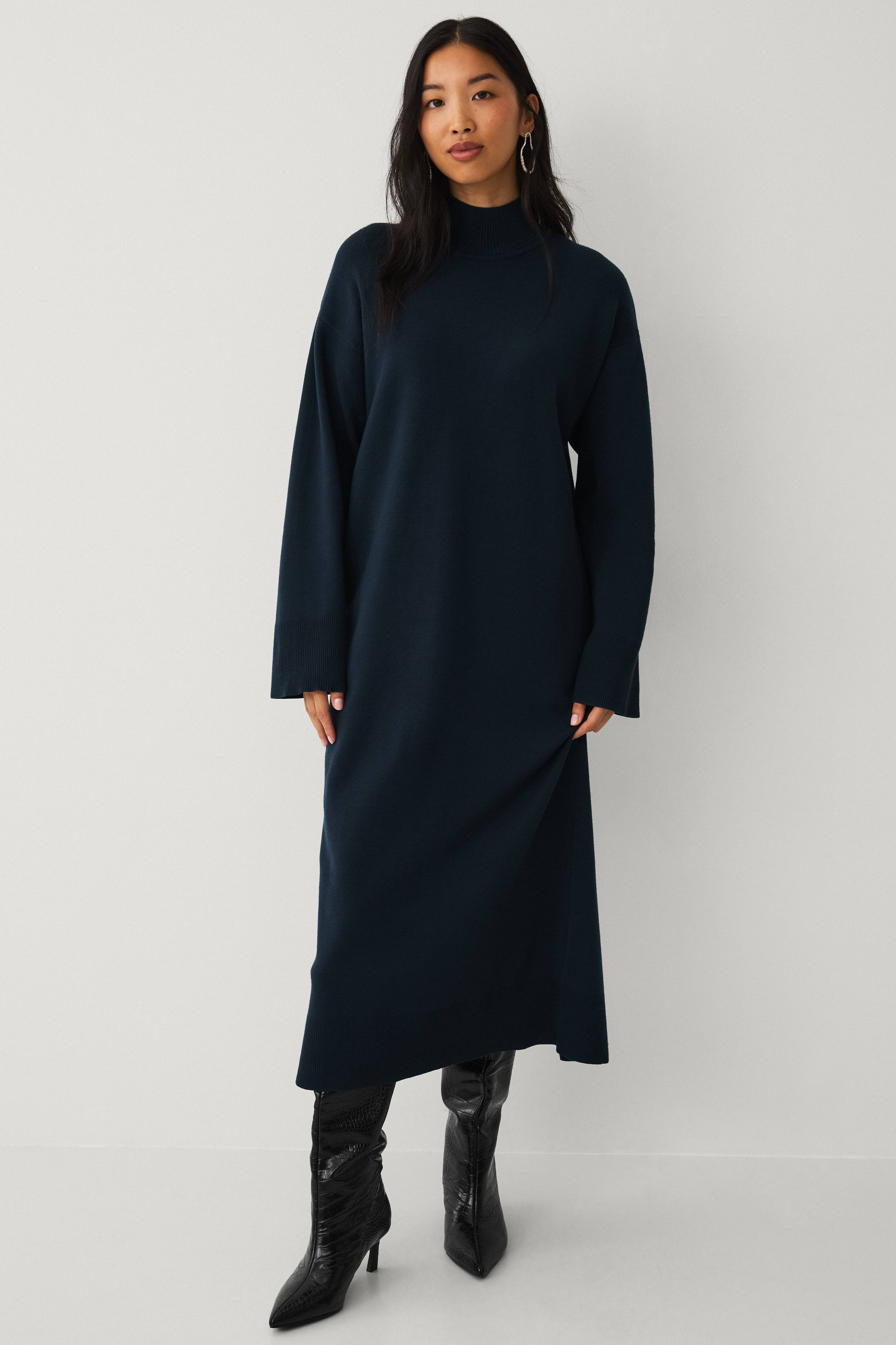 • Fintstrikket kjole i viskoseblanding• Ribbet opretstående krave• Nedsænkede skuldre• Ribstrik ved manchetterne og nederst• Slids nede bagved• Længde: 129 cm i størrelse S