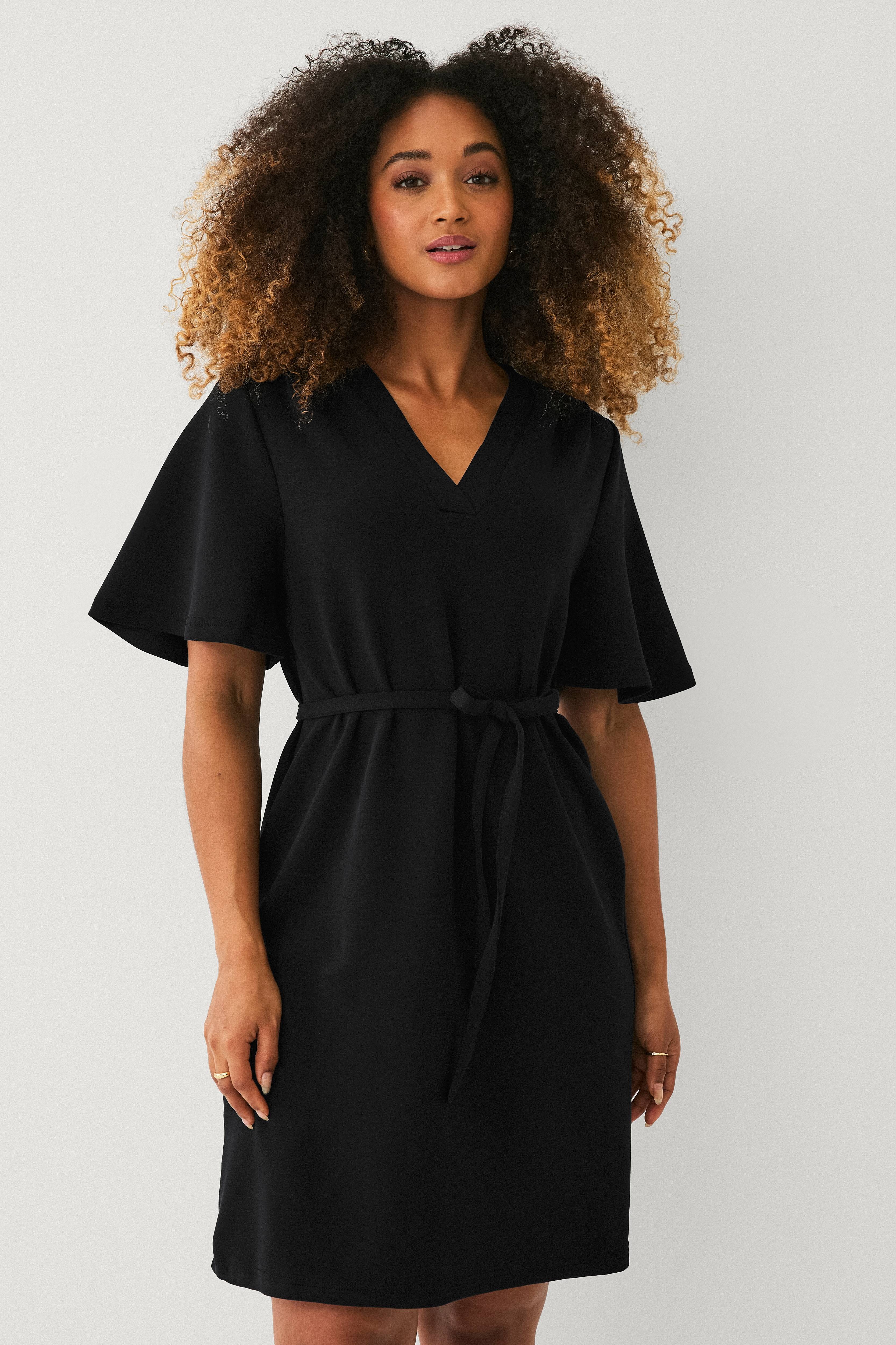 • Model med svaj i blød jersey• V-formet halsudskæring• Bokslæg på skuldrene• Kort, bredt ærme• Tyndt bindebælte• Længde: 96 cm i størrelse S