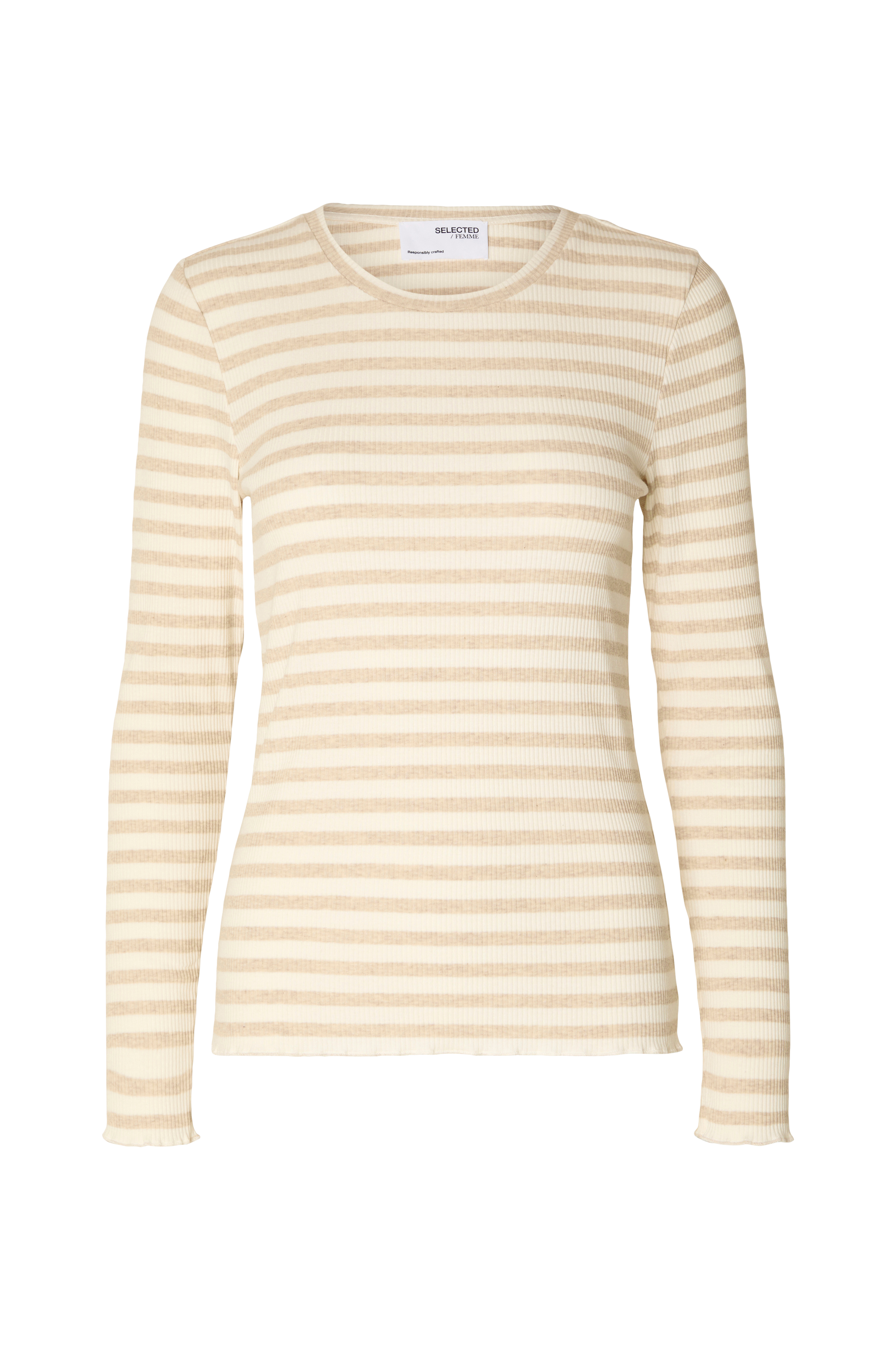 Stribet top i jerseyrib af økologisk bomuld. Kropsnær model med lange ærmer og bølget kant forneden og i ærmekanterne.