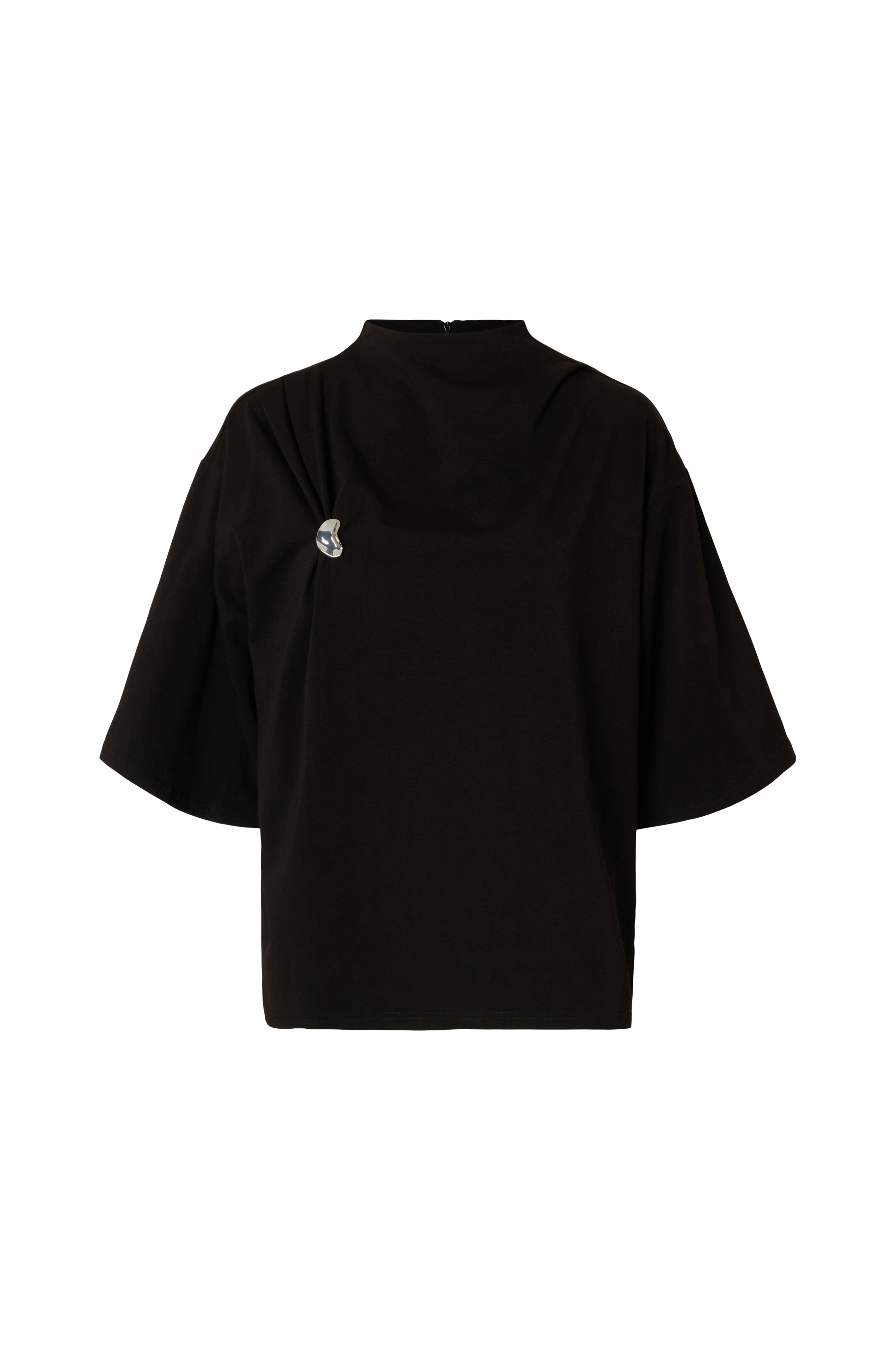 • Top med høj krave• Halvlange ærmer• Skjult lynlås i ryggen• Rynket detalje