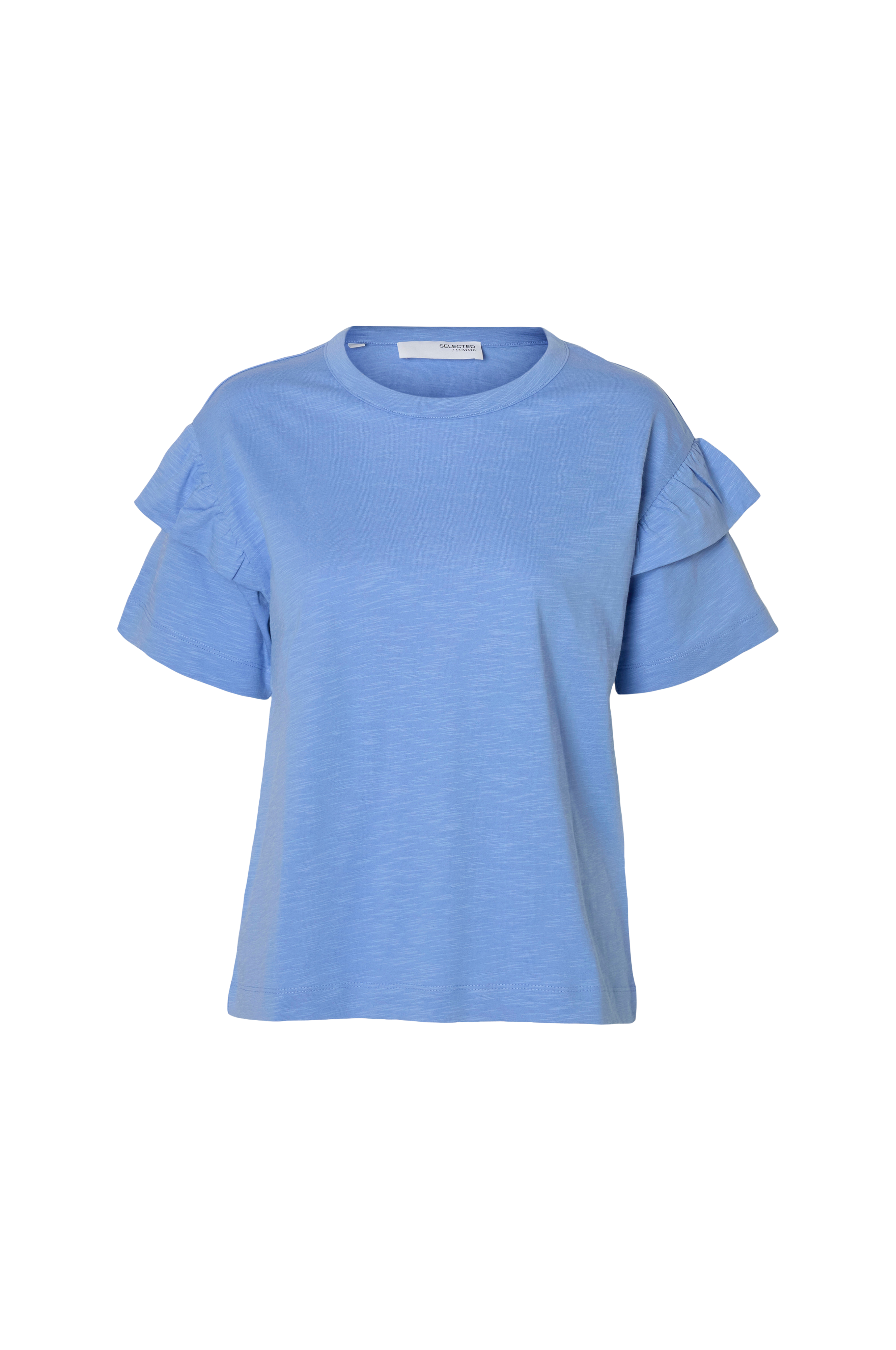 • Kort ærme med volant • Rund hals • Chunky jersey med struktur • Produktet indeholder økologisk bomuld, som er dyrket uden kemiske sprøjtemidler, kunstgødning og genmodificerede afgrøder (GMO). Dette betyder et sundere arbejdsmiljø for landmænd og bedre jord.